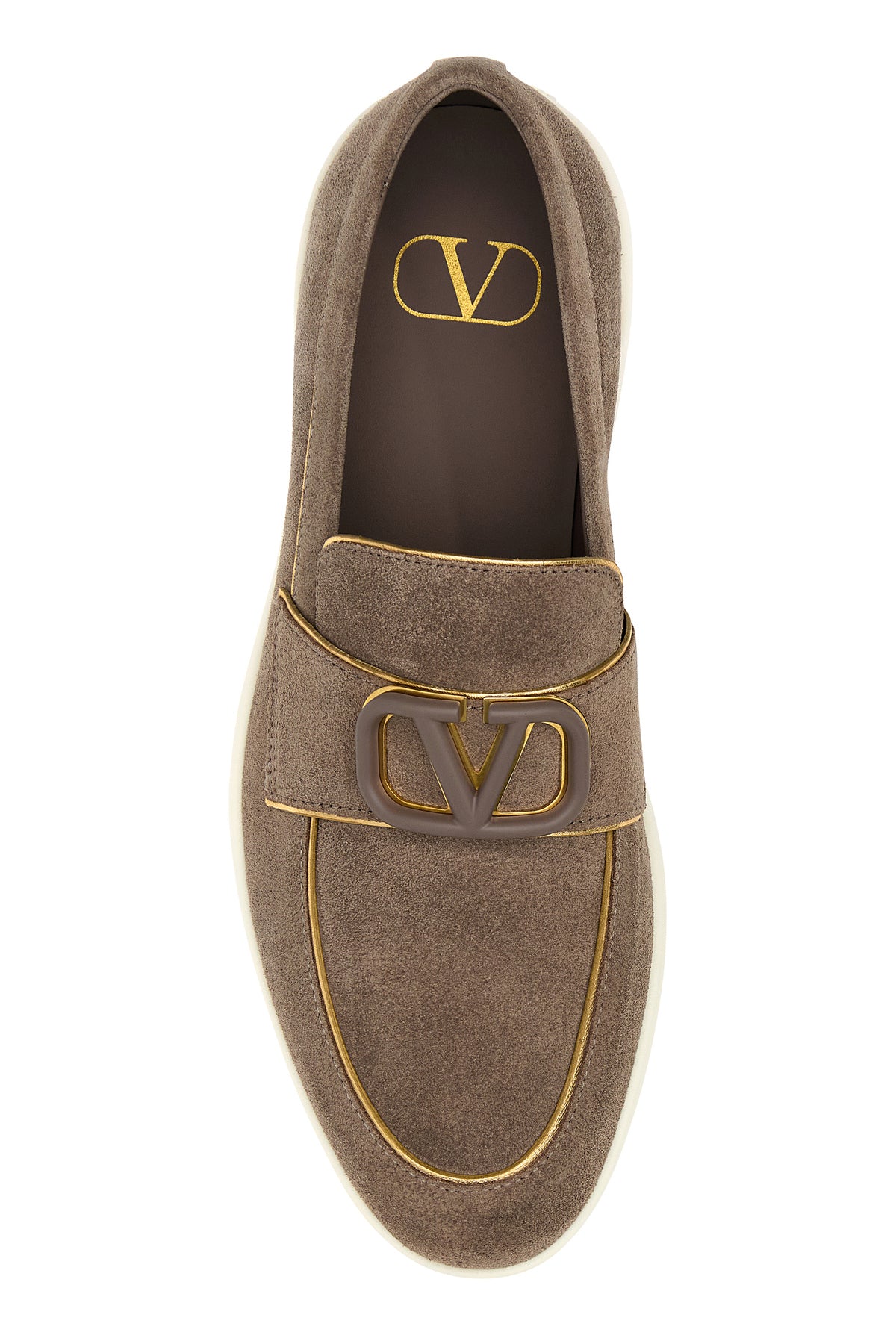 Loafers realized in suede with laminated leather trimmings enriched by tonal VLogo detail on the vamp.