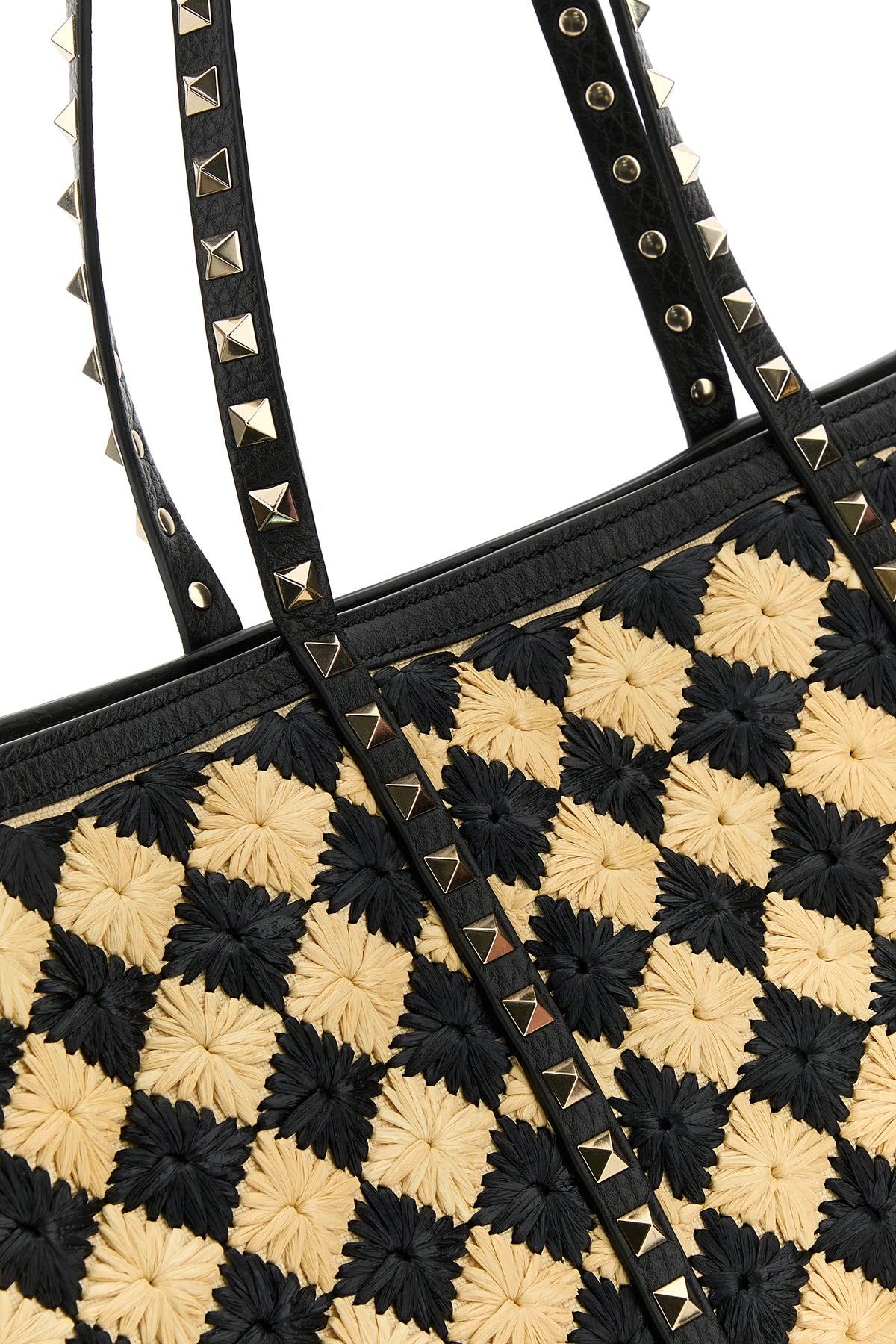 Shopping bag realized in raffia with leather inserts characterized by checked embroidery on the entire surface enriched by metal studs at the front and at the back.