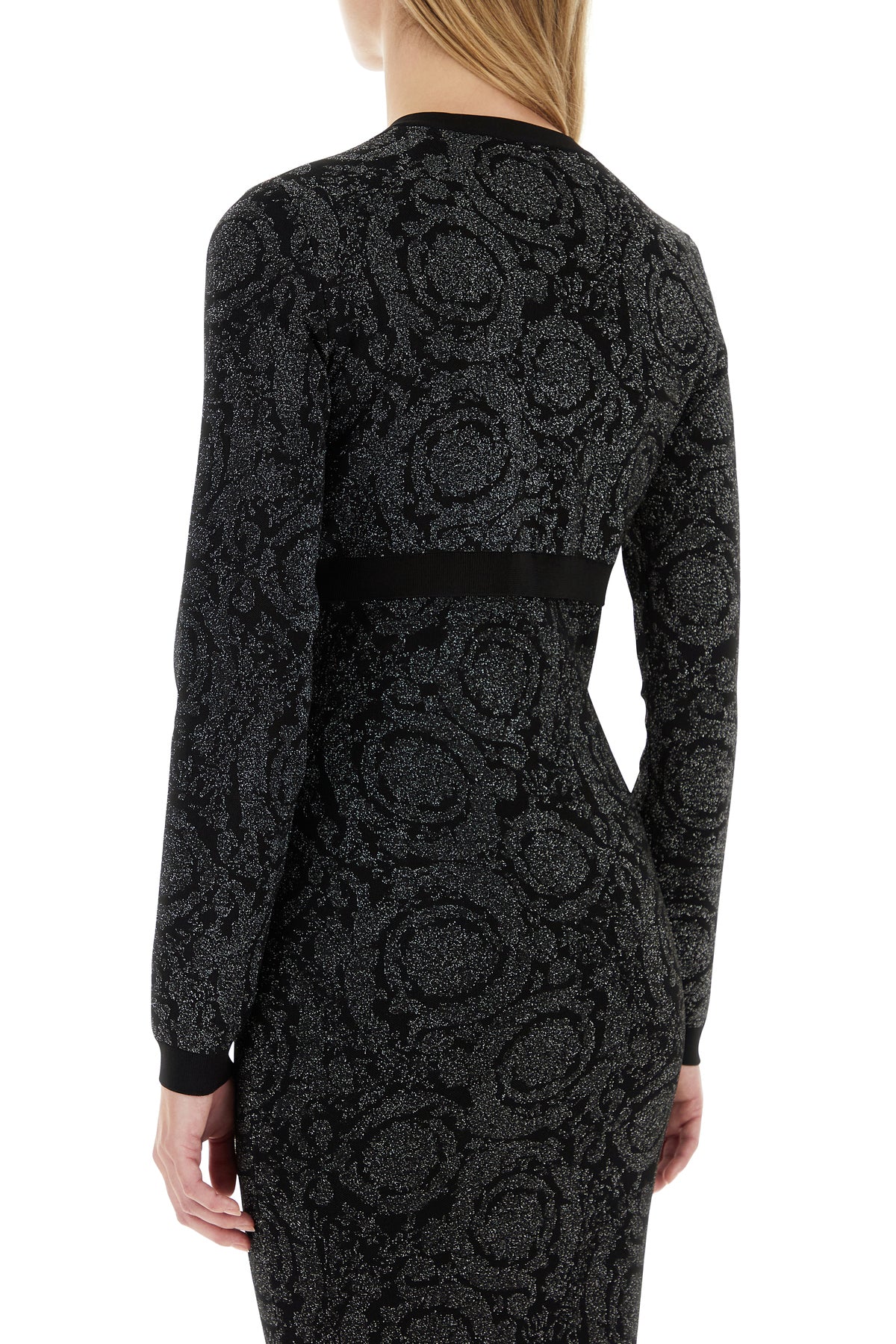 Cropped-cut cardigan realized in stretch viscose blend with lurex threads characterized by Baroque embroidery on the entire surface.