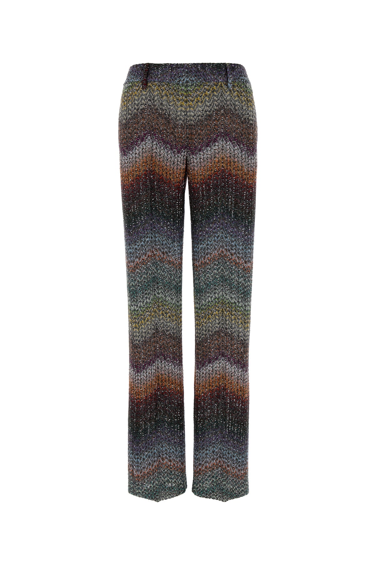 Pant realized in viscose blend with lurex threads and sequins characterized by chevron motif embroidery on the entire surface.