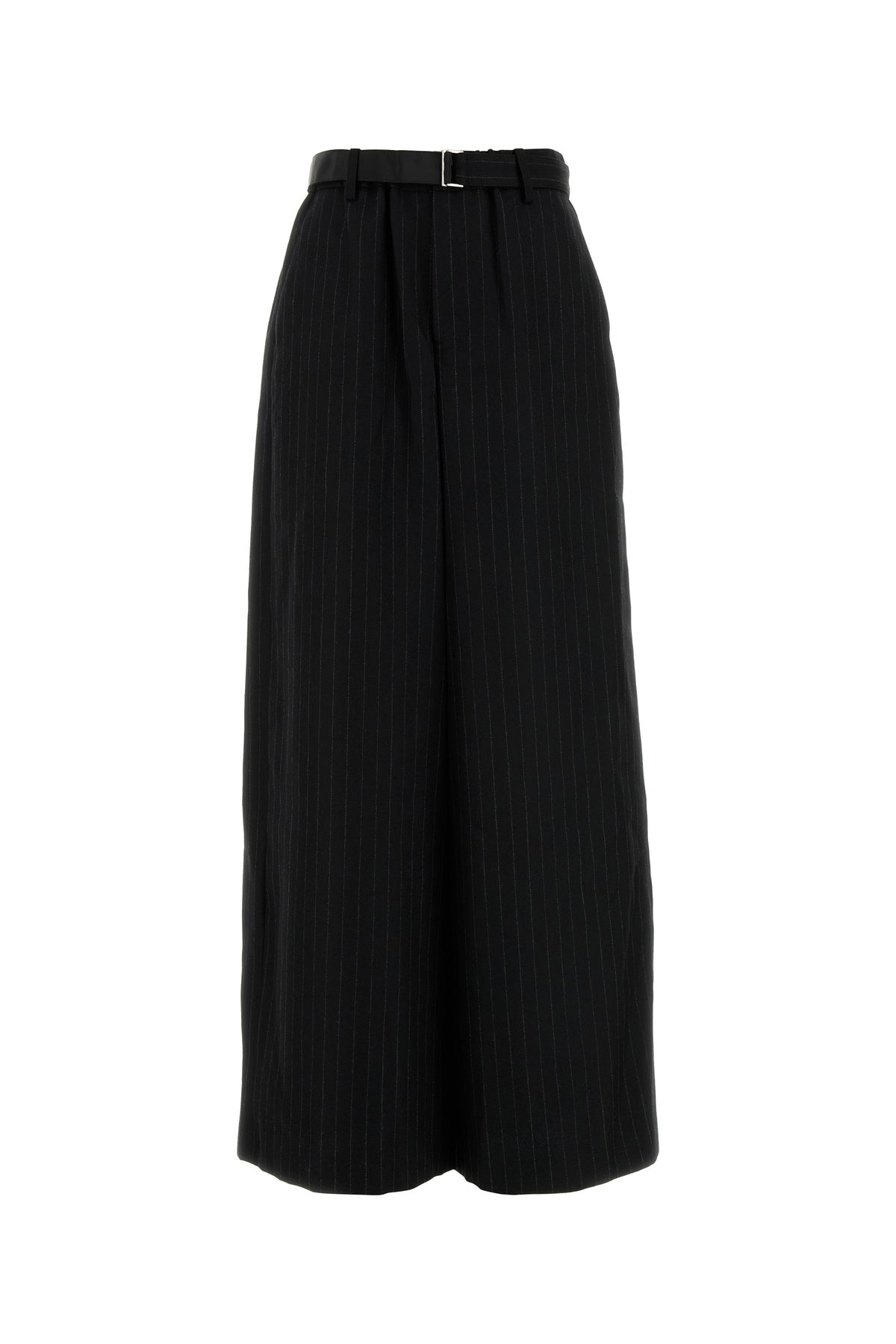 Wide-leg pant realized in pure wool characterize by pinstriped motif embroidery on the entire surface.