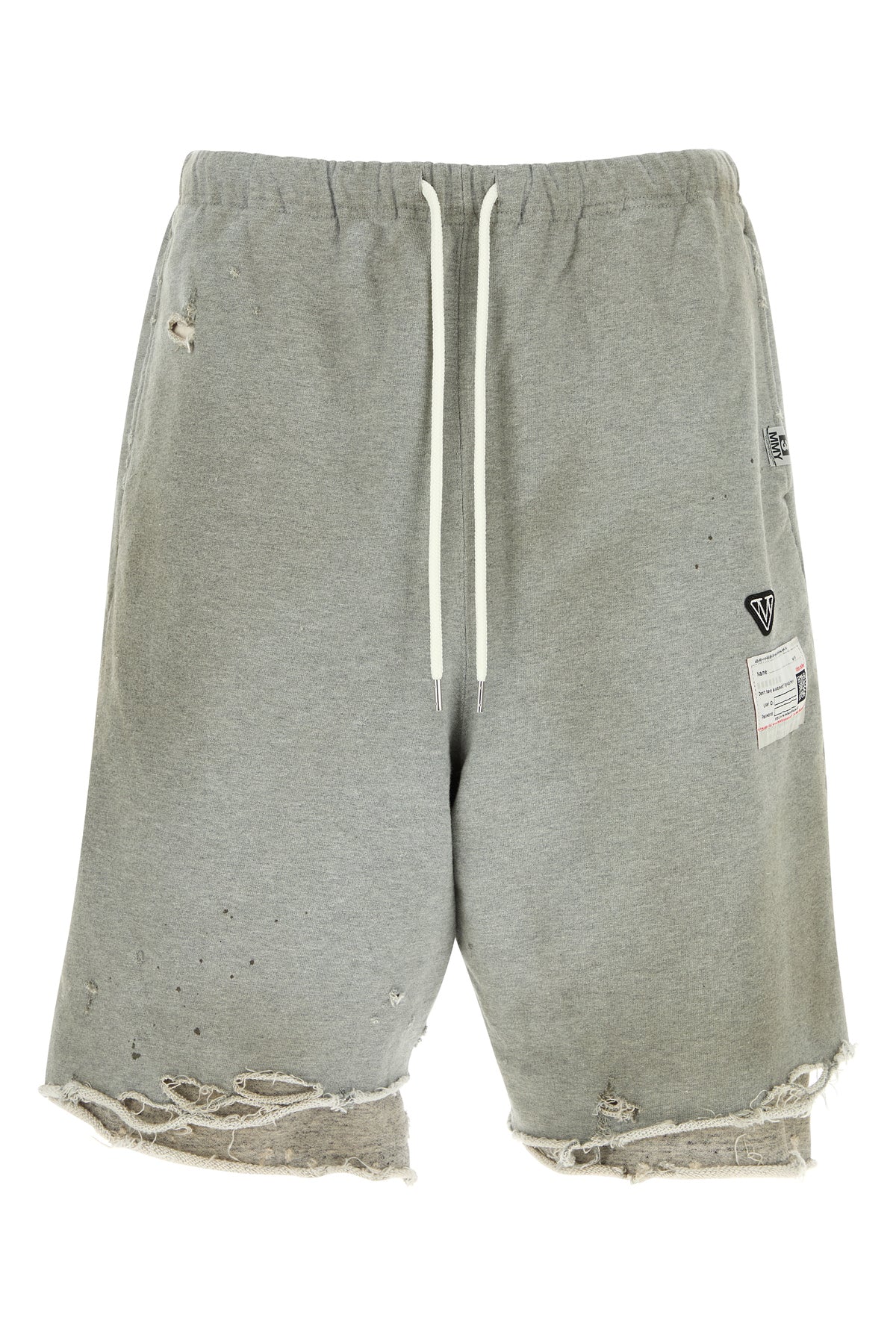 Bermuda shorts realized in slightly distressed and vintage effect pure cotton enriched by peculiar patches on the side.