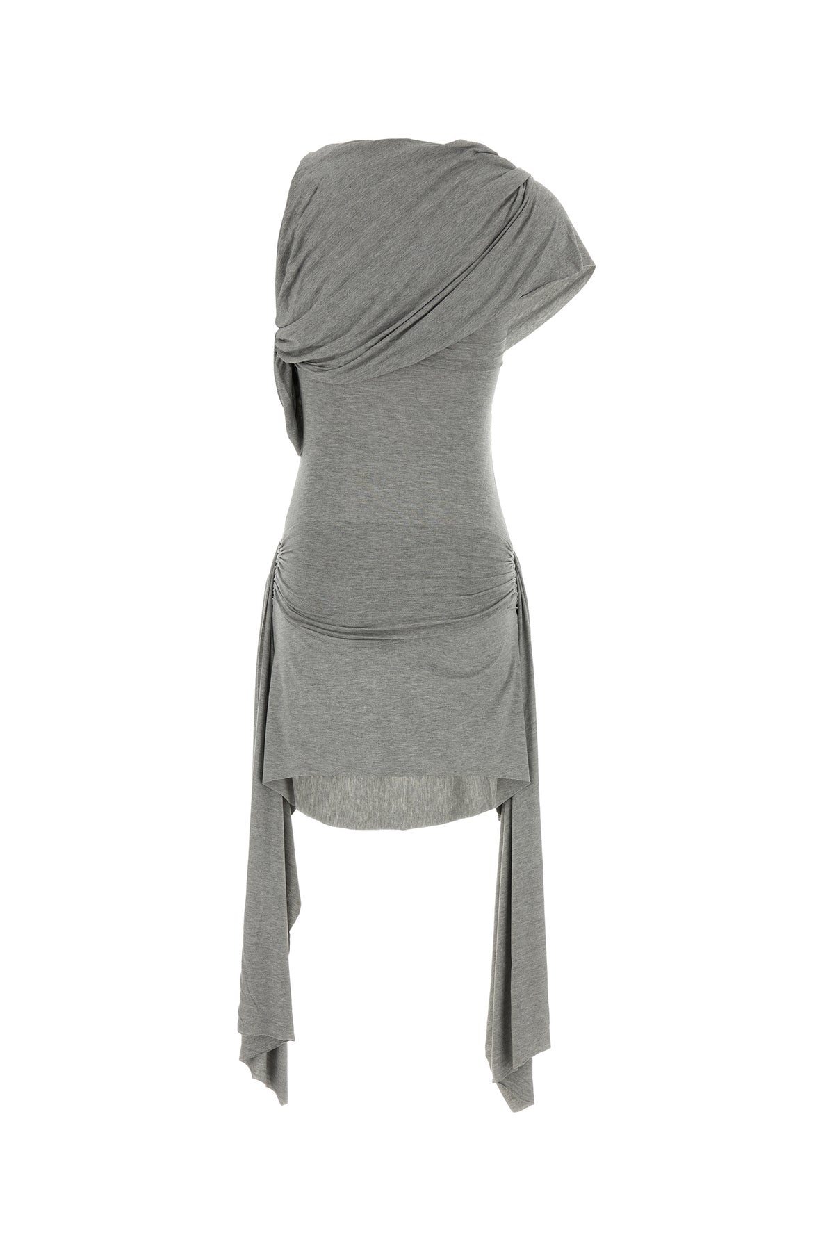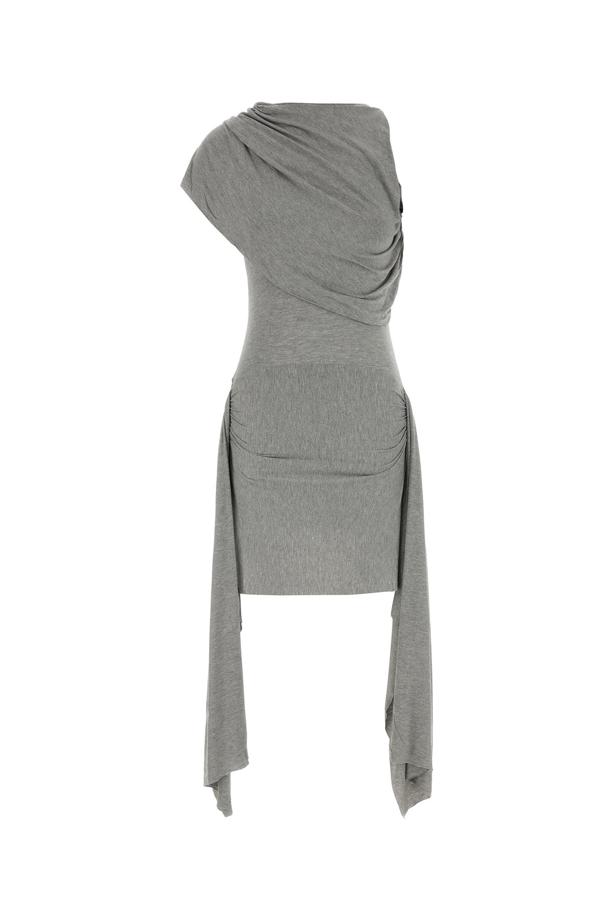 Draped midi-length dress realized in stretch viscose enriched by lateral panels on the hemline.