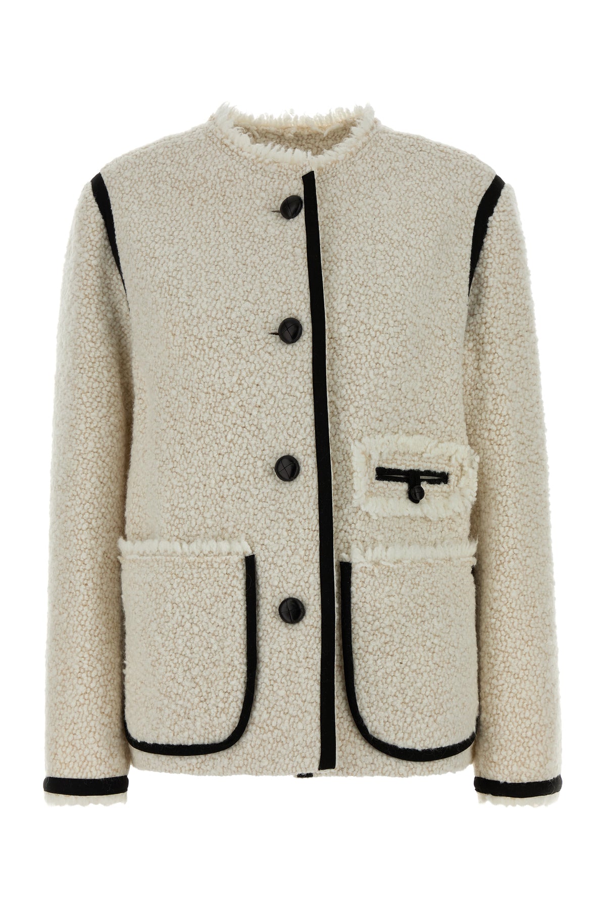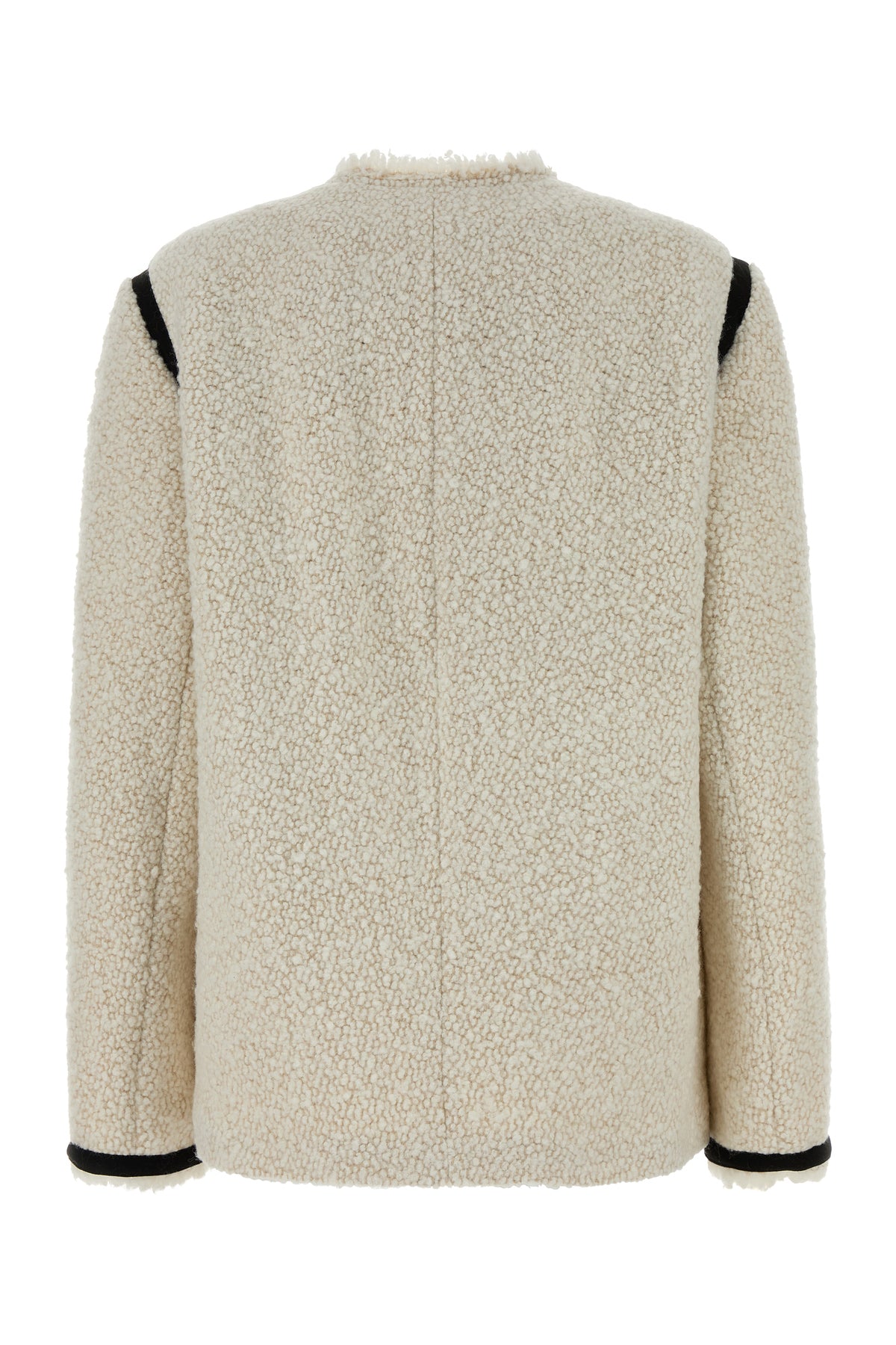 Short-cut coat realized in tweed bouclé enriched by contrasting trimmings.