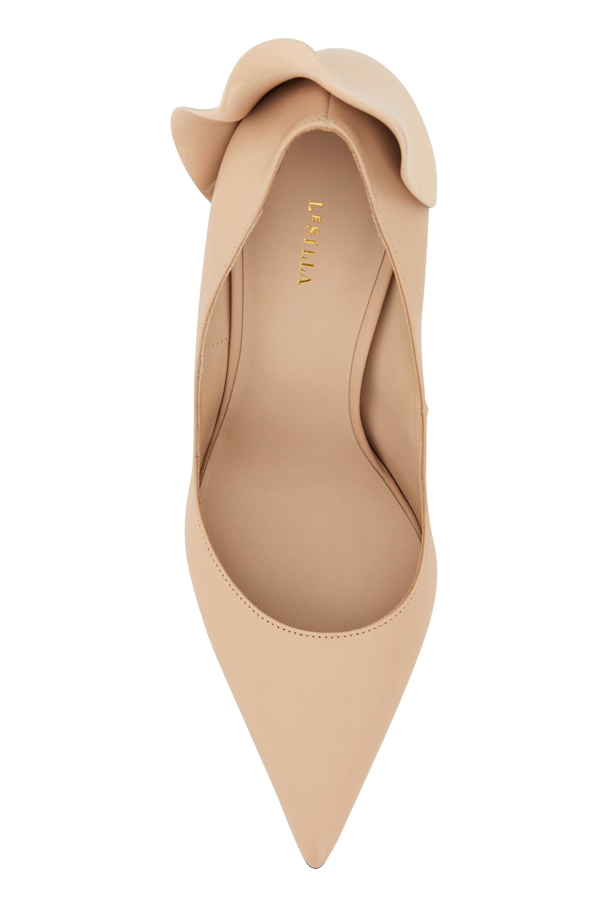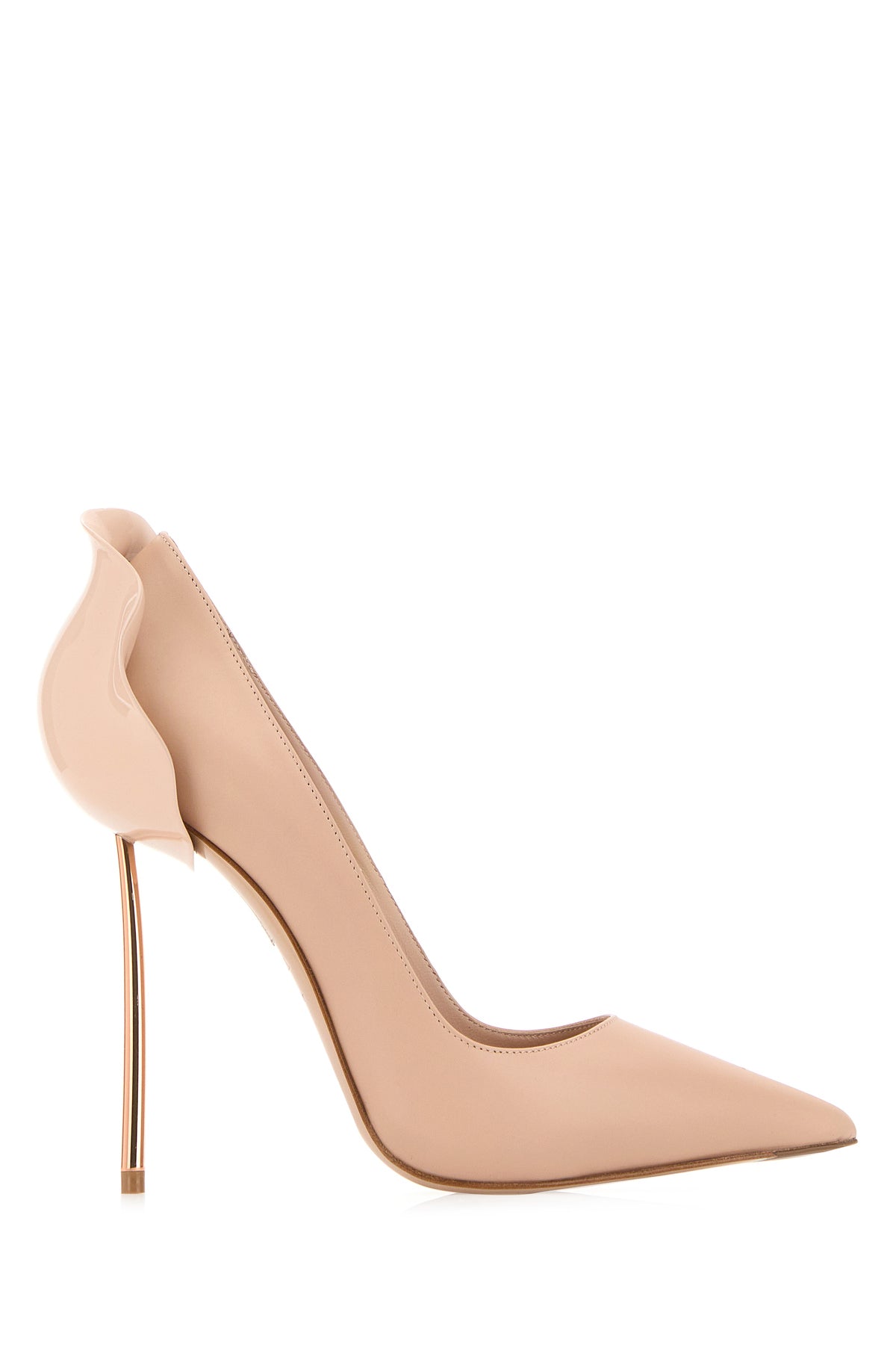 Pumps realized in smooth leather enriched by metal petal-shaped detail at the back.