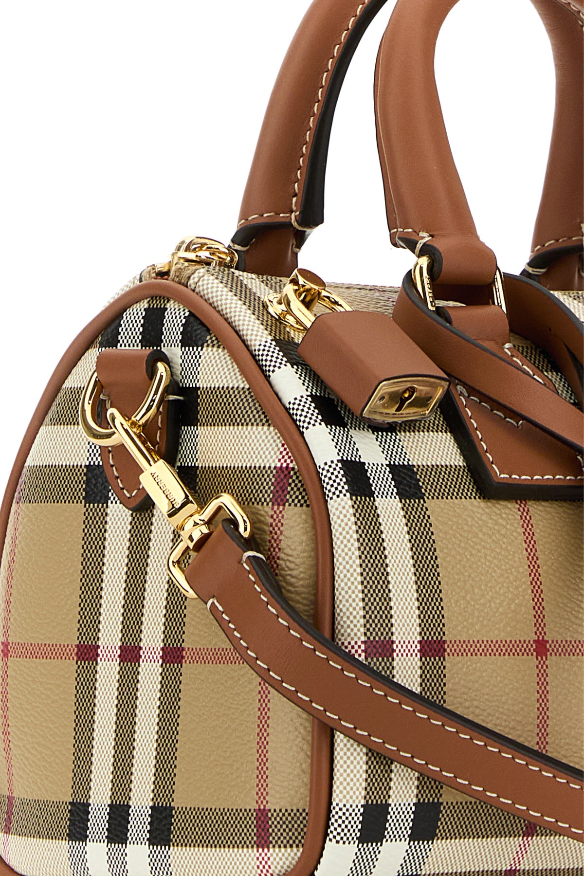 Handbag realized in coated canvas characterized by Burberry Check motif print on the entire surface enriched by detachable leather accessory.
