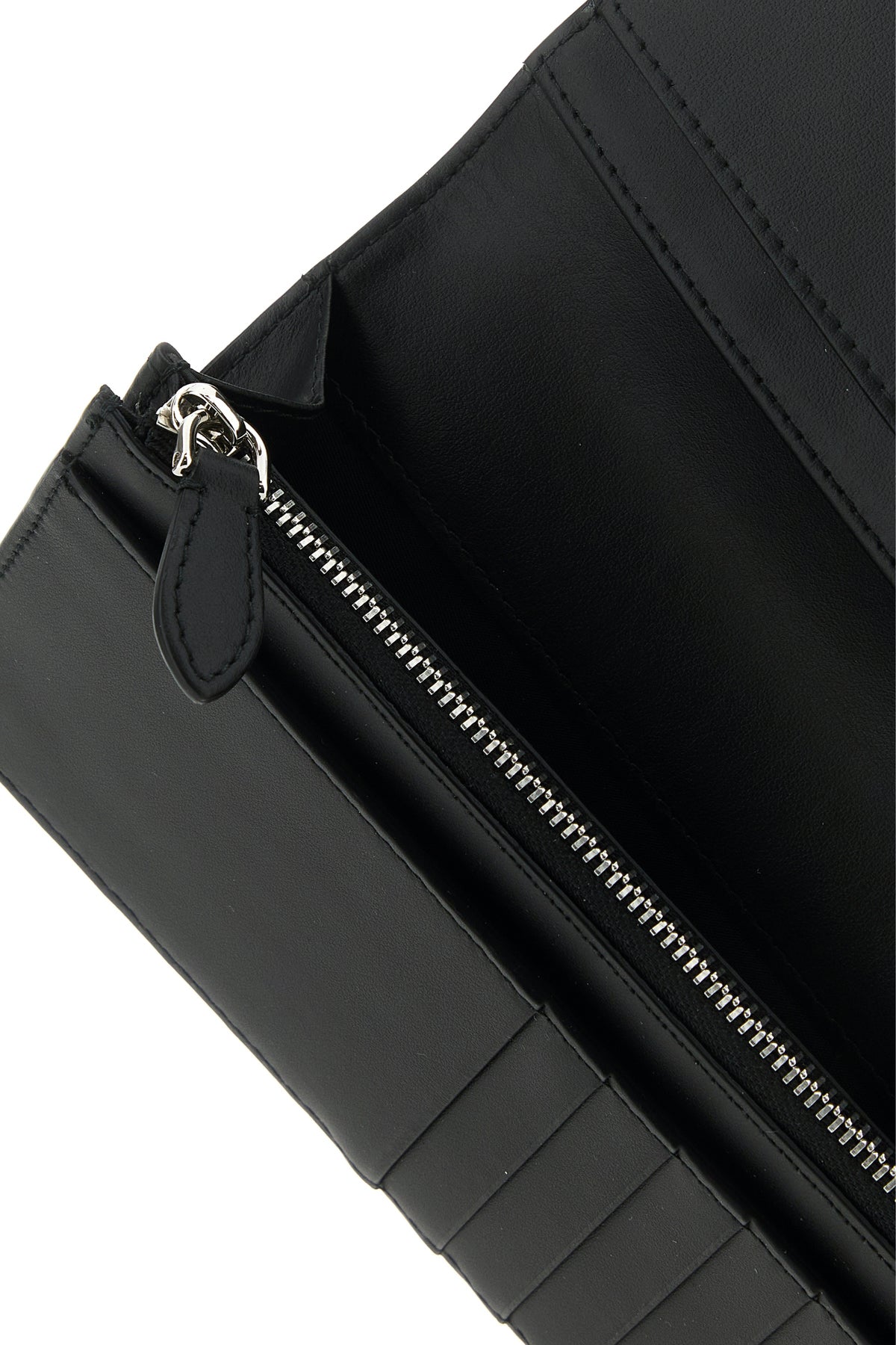 - Interior with a gusseted compartment, a coin pocket, three slit pockets and sixteen credit card slots