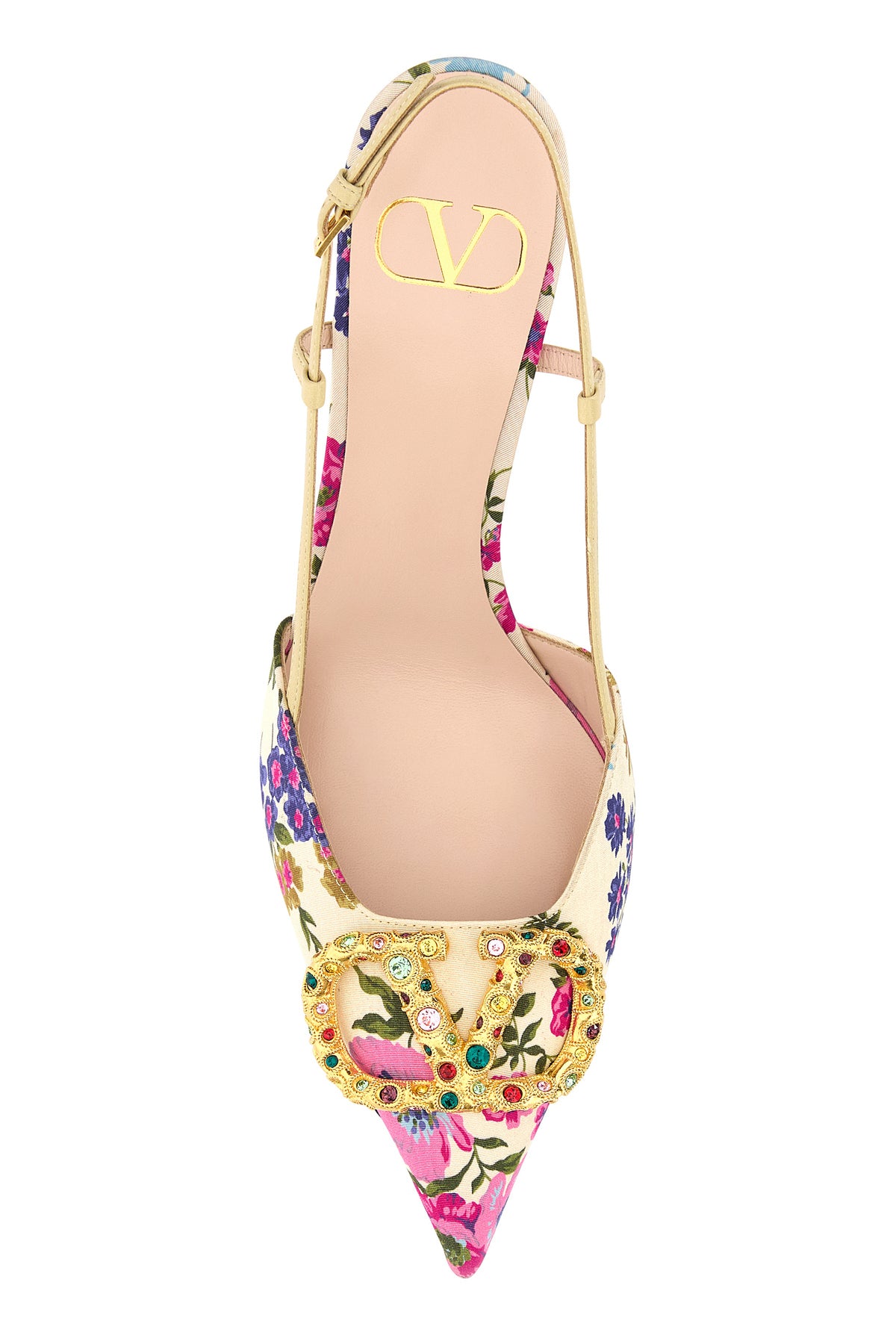 Slingback realizzate in fabric characterized by floral print on the entire surface enriched by VLogo Signature metal detail on the toe.