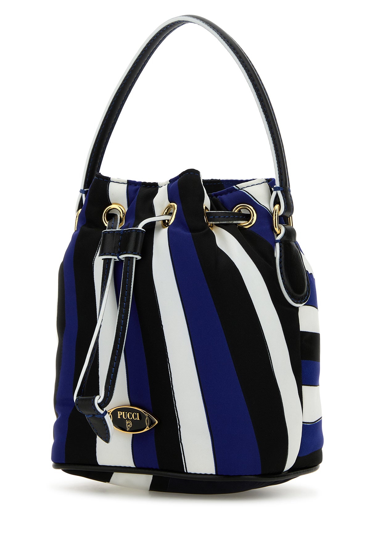 Bucket bag realized in nylon characterized by peculiar print on the entire surface enriched by metal logoed plate at the front.