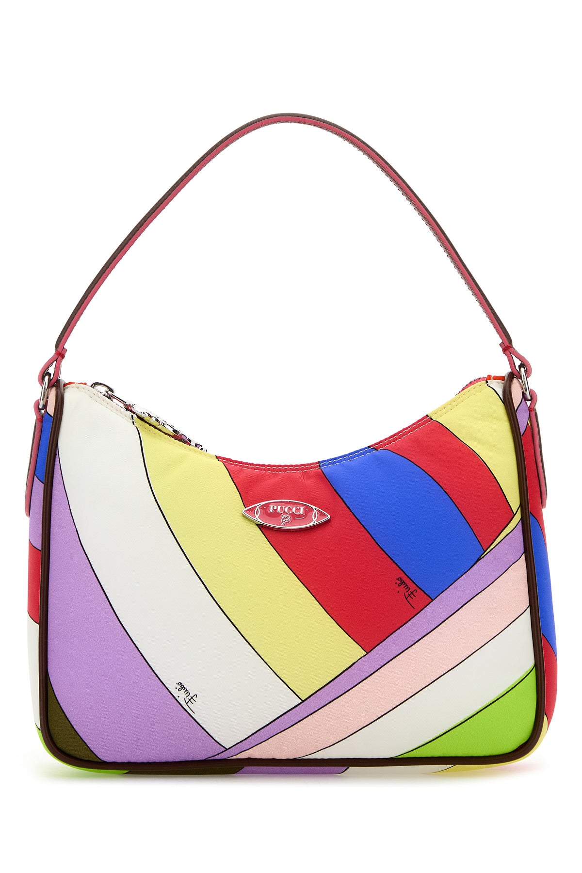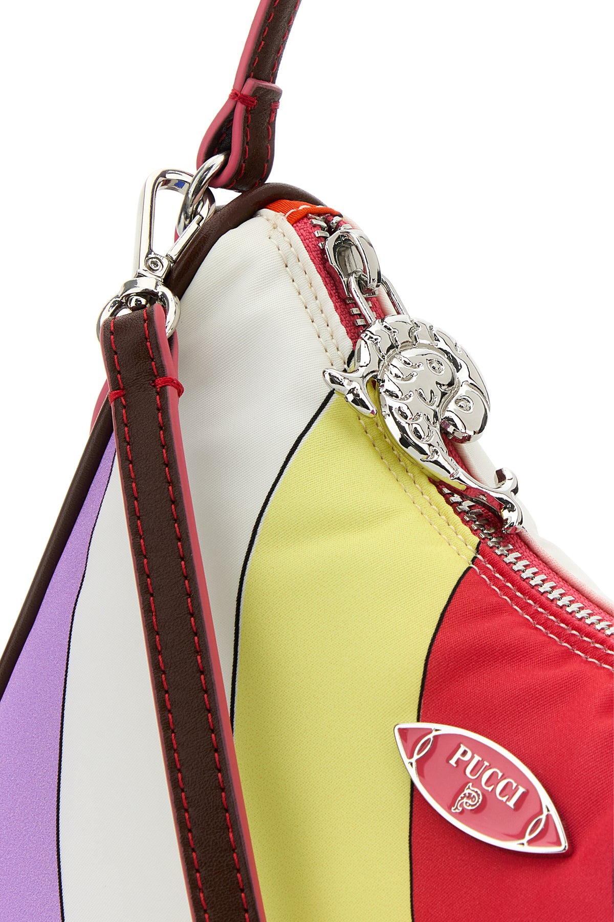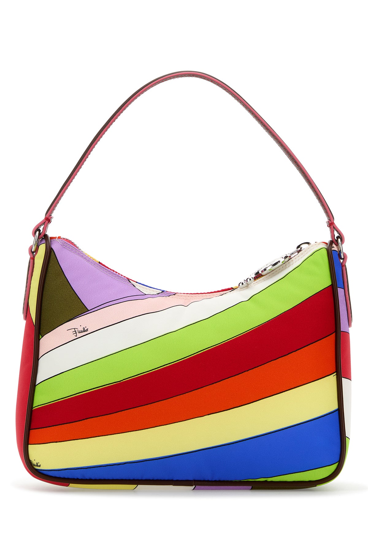 Shoulder bag realized in nylon characterized by peculiar print on the entire surface enriched by metal logoed plate at the front.