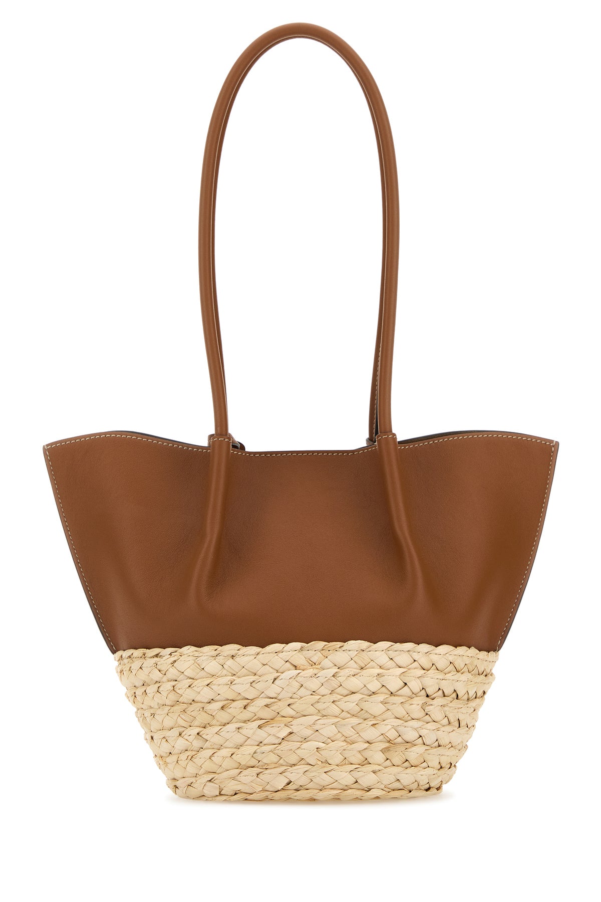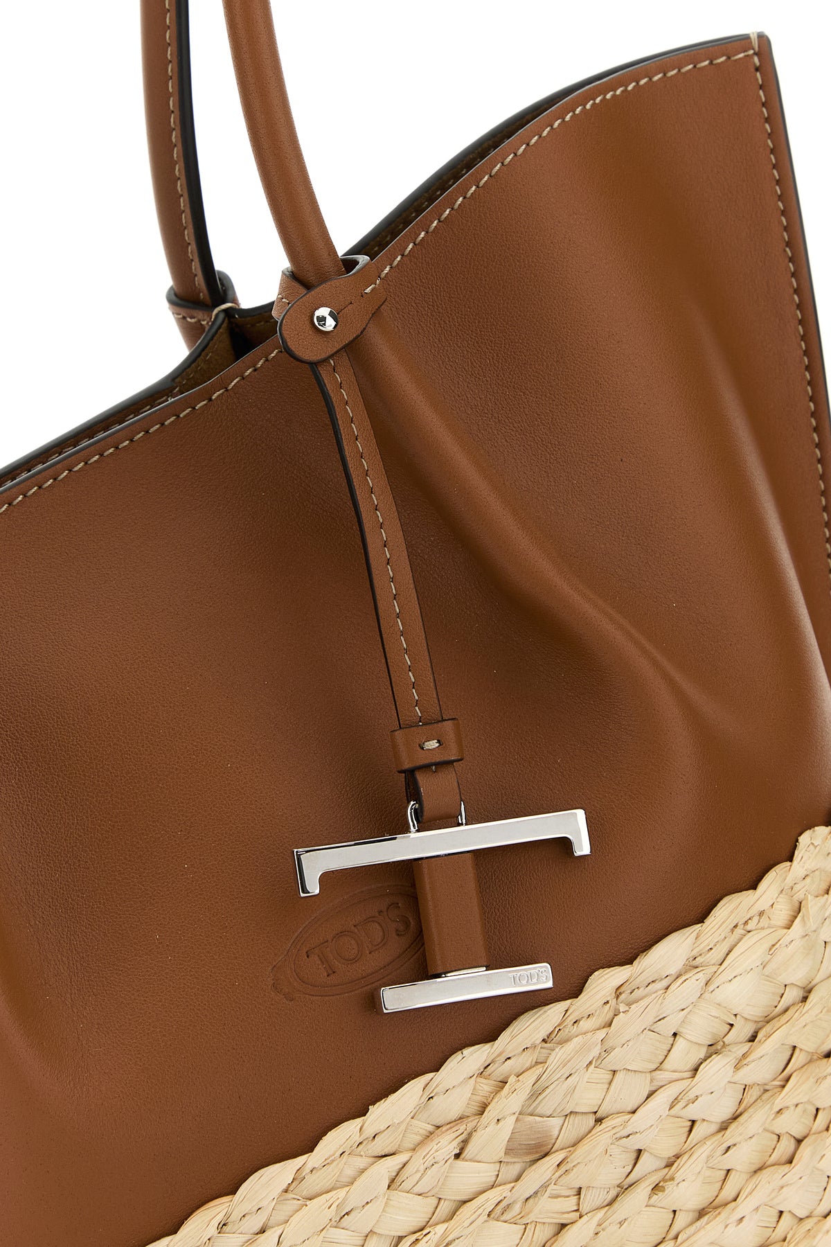 Shopping bag realized in smooth leather and woven raffia characterized by embossed logo at the front enriched by detachable accessory with metal T detail.