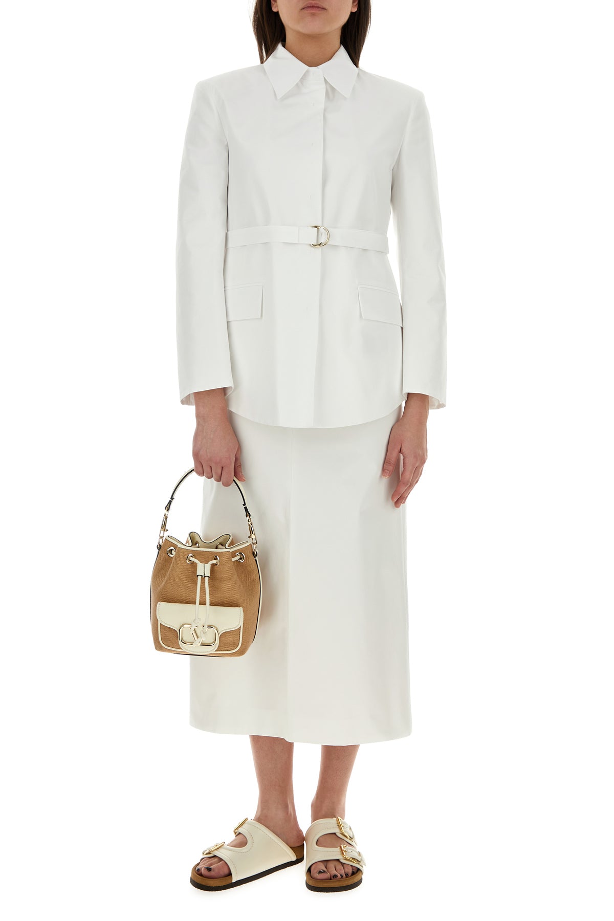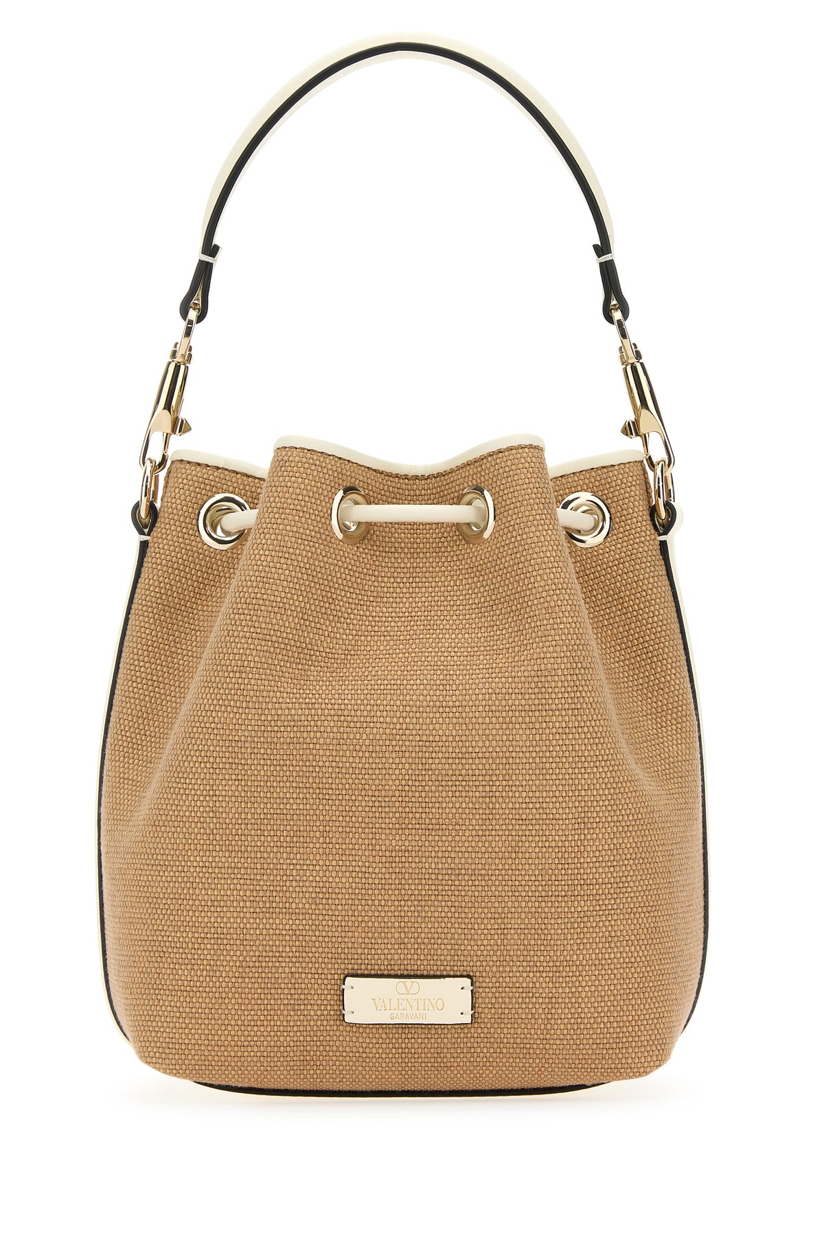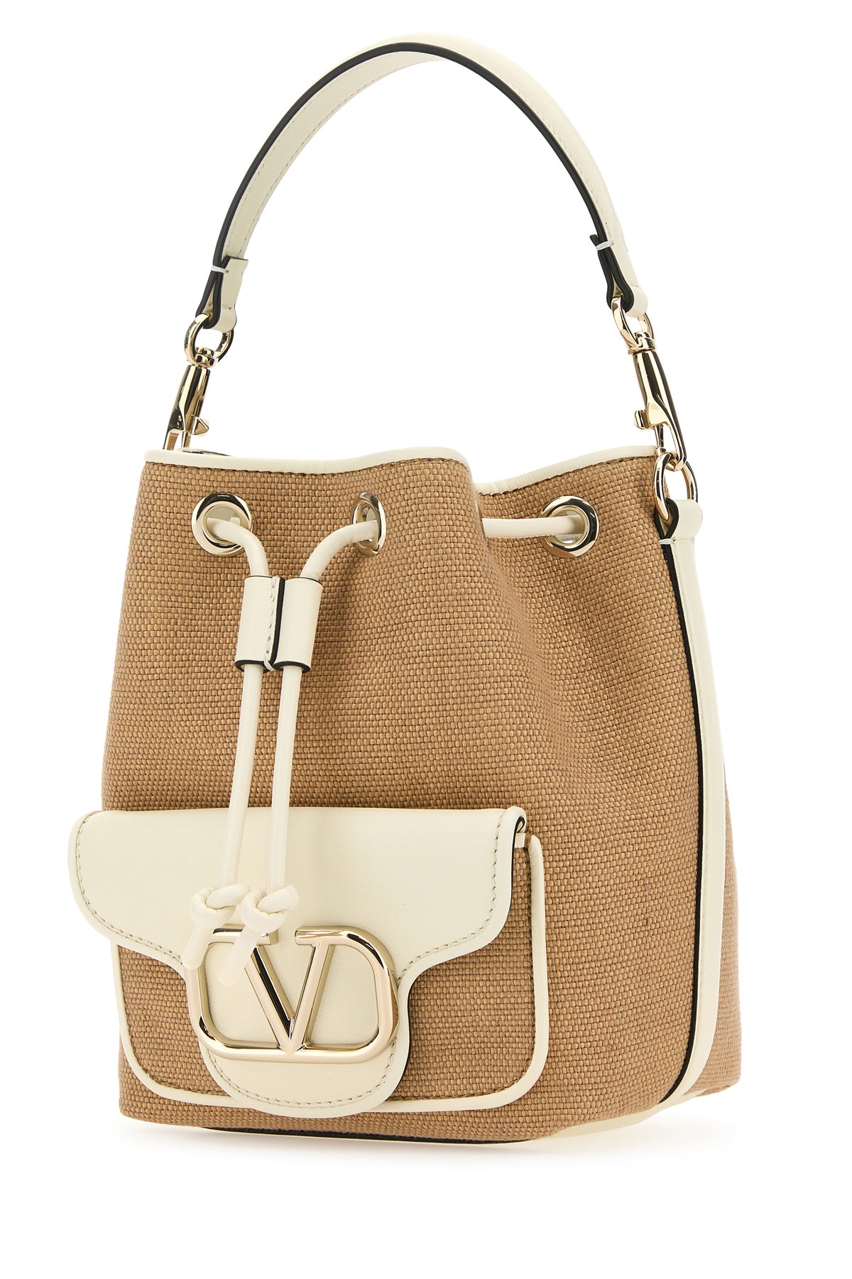 Bucket bag realized in woven raffia with leather inserts enriched by metal VLogo detail at the front.