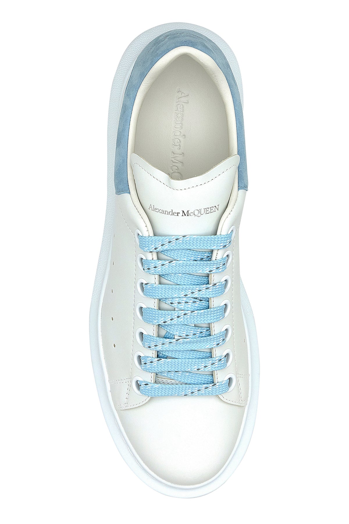 White leather sneakers with pastel light blue suede heel