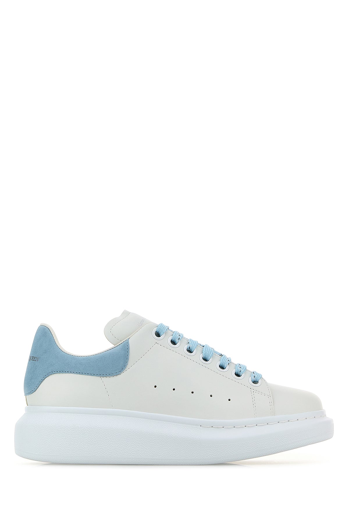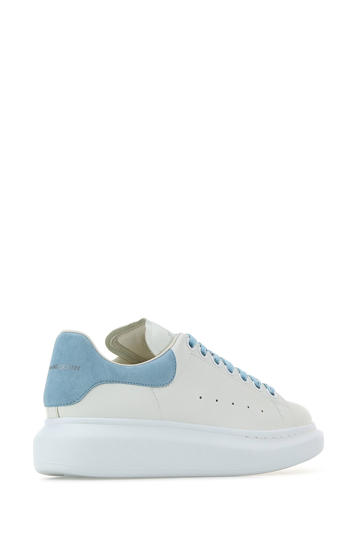 White leather sneakers with pastel light blue suede heel