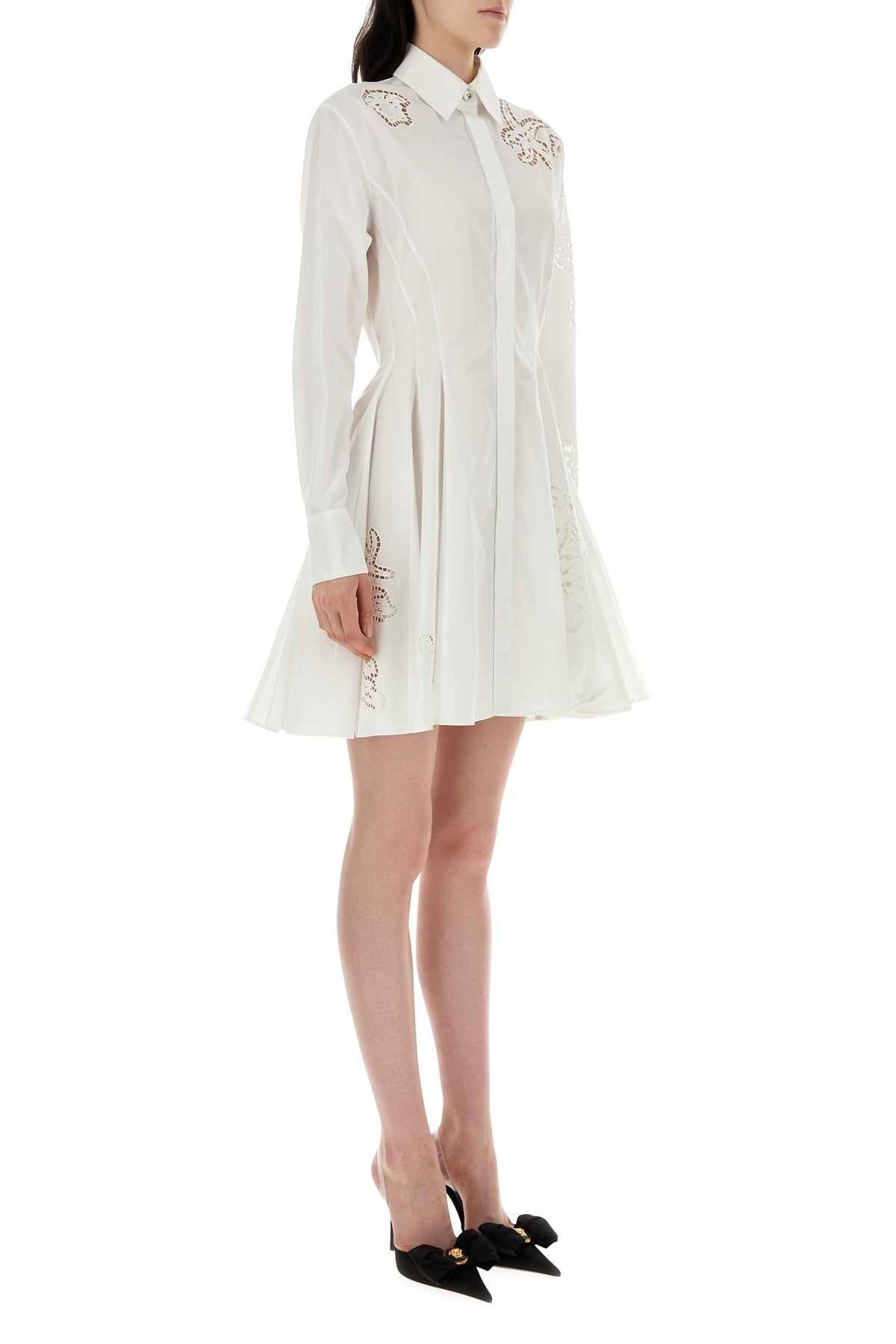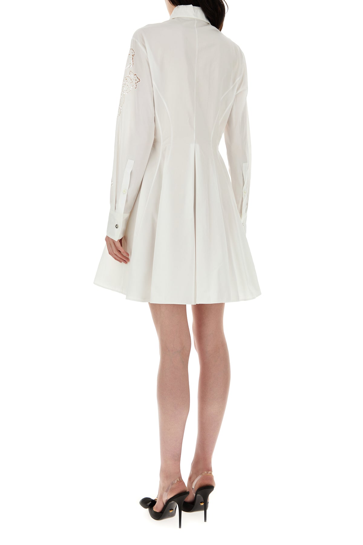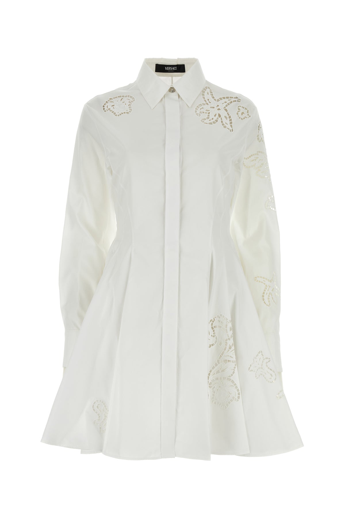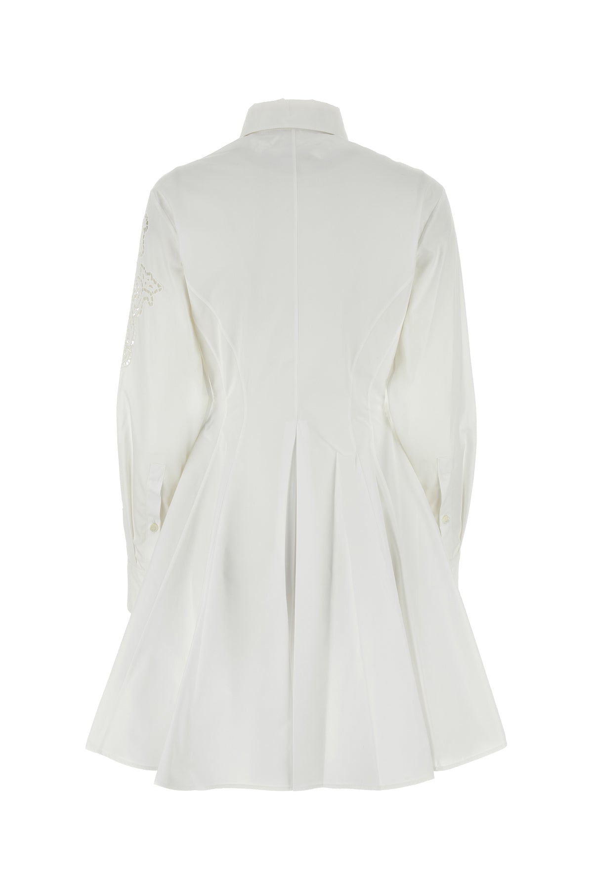 Shirt dress realized in pure cotton poplin characterized by peculiar tonal embroideries at the front.