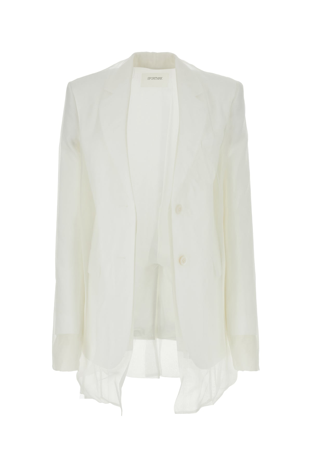 Layered blazer realized in pure silk characterized by padded shoulders.