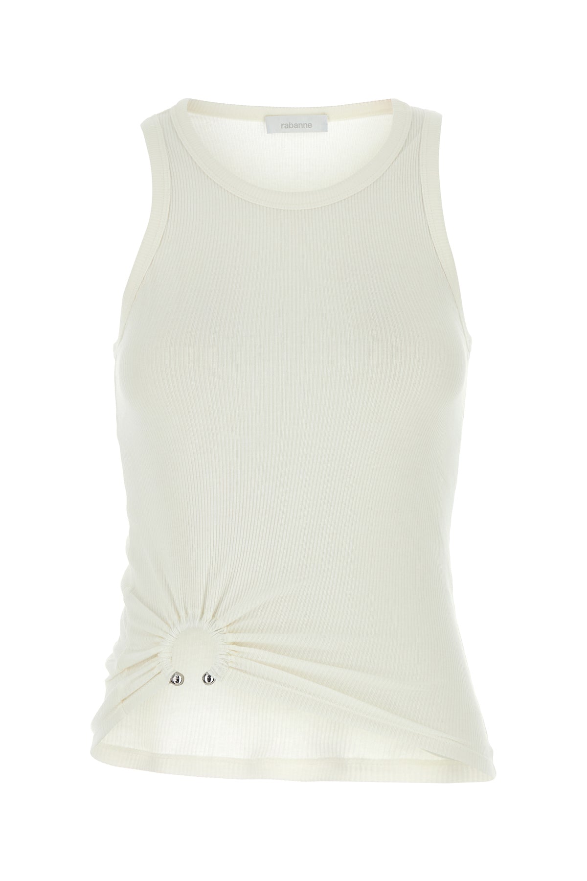 Tank top realized in ribbed stretch cotton enriched by decorative rigid metal ring at the front.