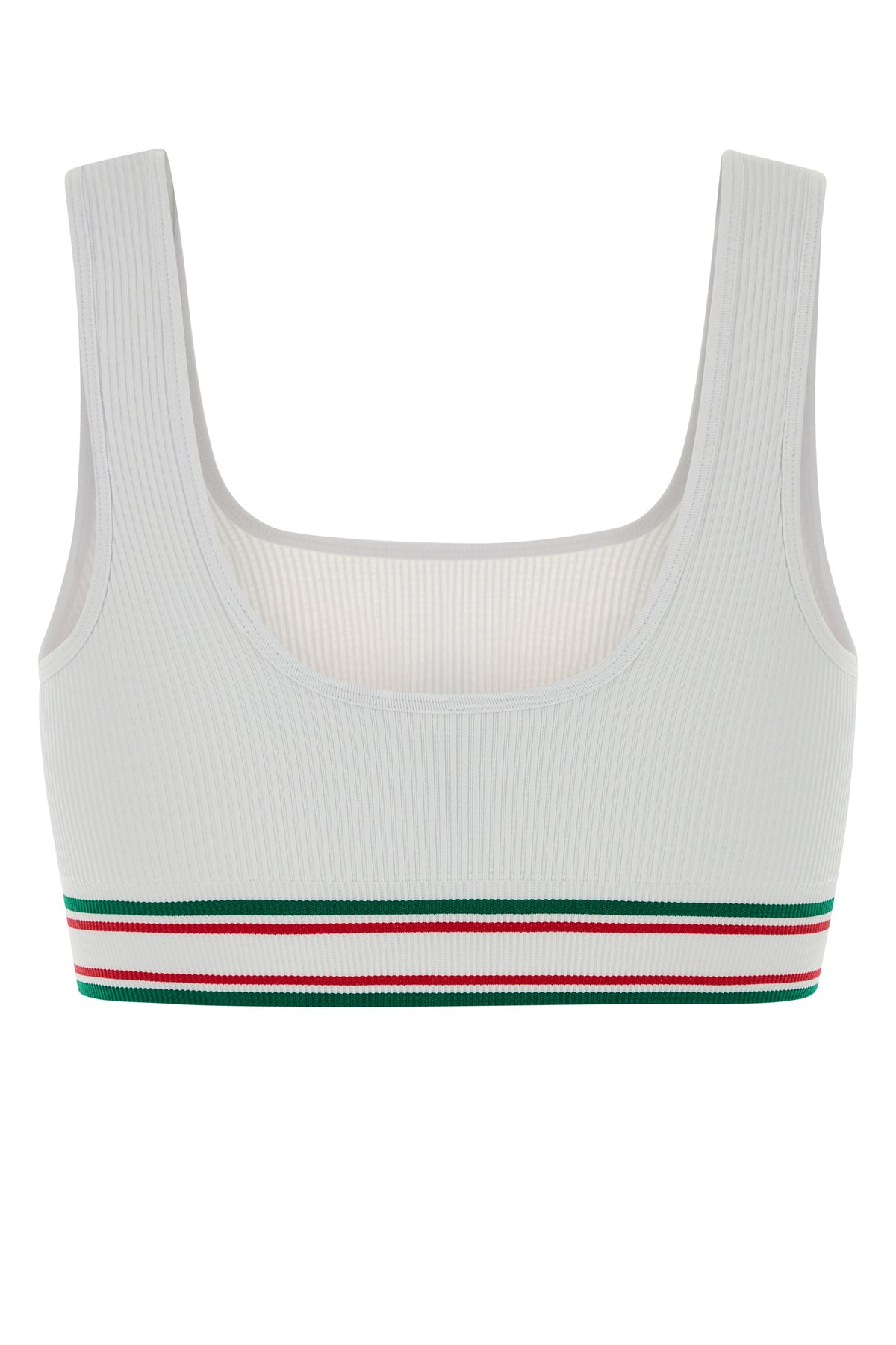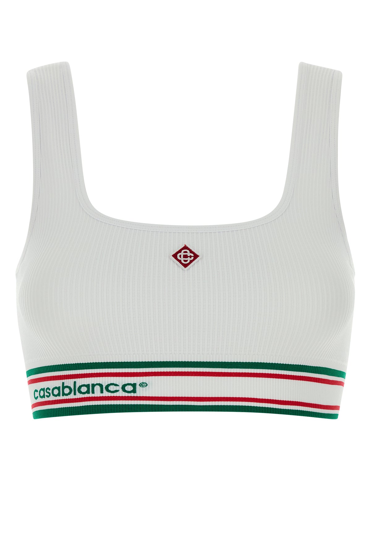 Crop-top realized in ribbed stretch nylon blend characterized by logoed band on the hemline enriched by logoed patch at the front.