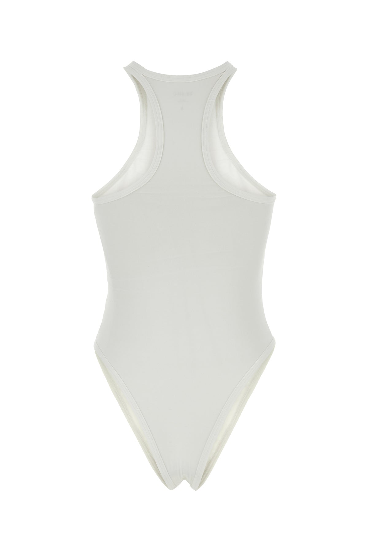 Swimsuit realized in stretch nylon characterized by logoed hook closure at the top.