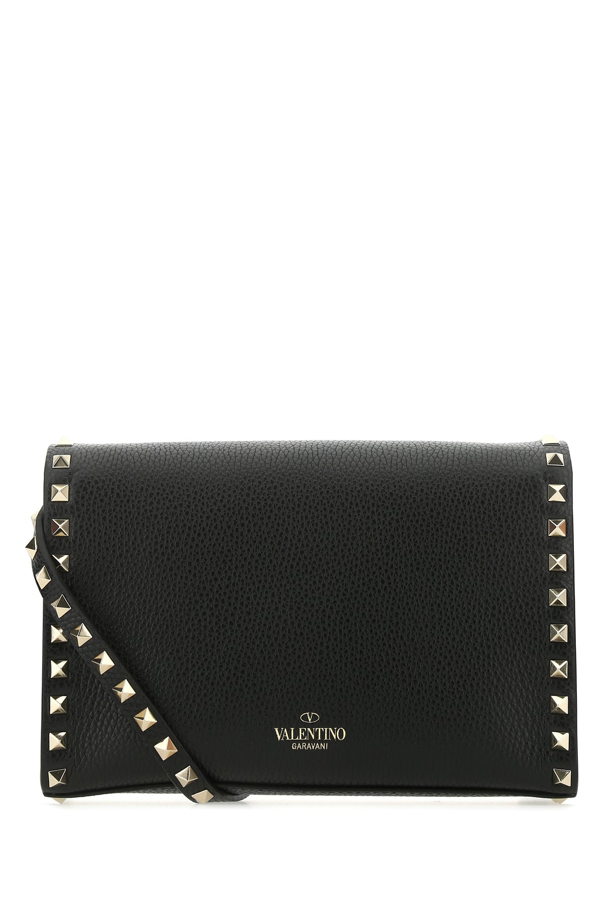 Crossbody bag realized in pebble leather characterized by laminated printed logo at the back enriched by studs along the trimmings.