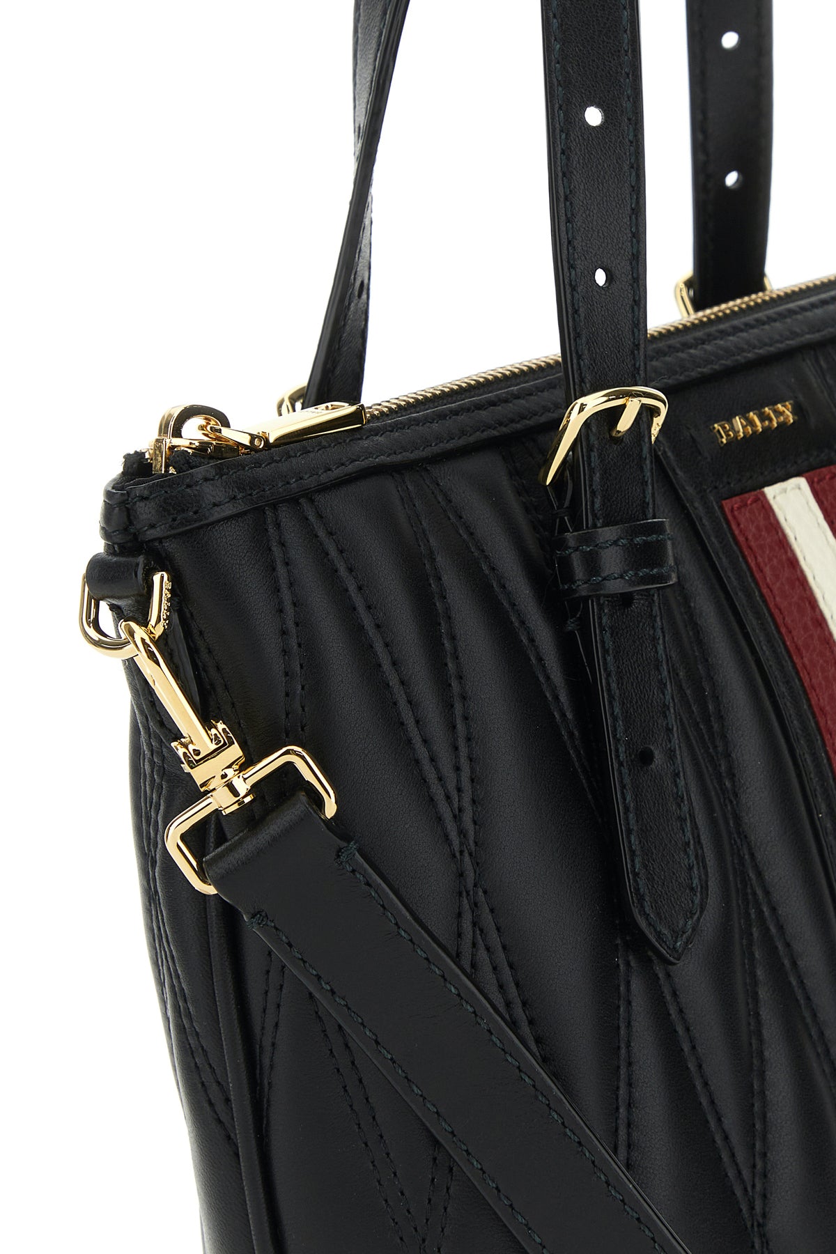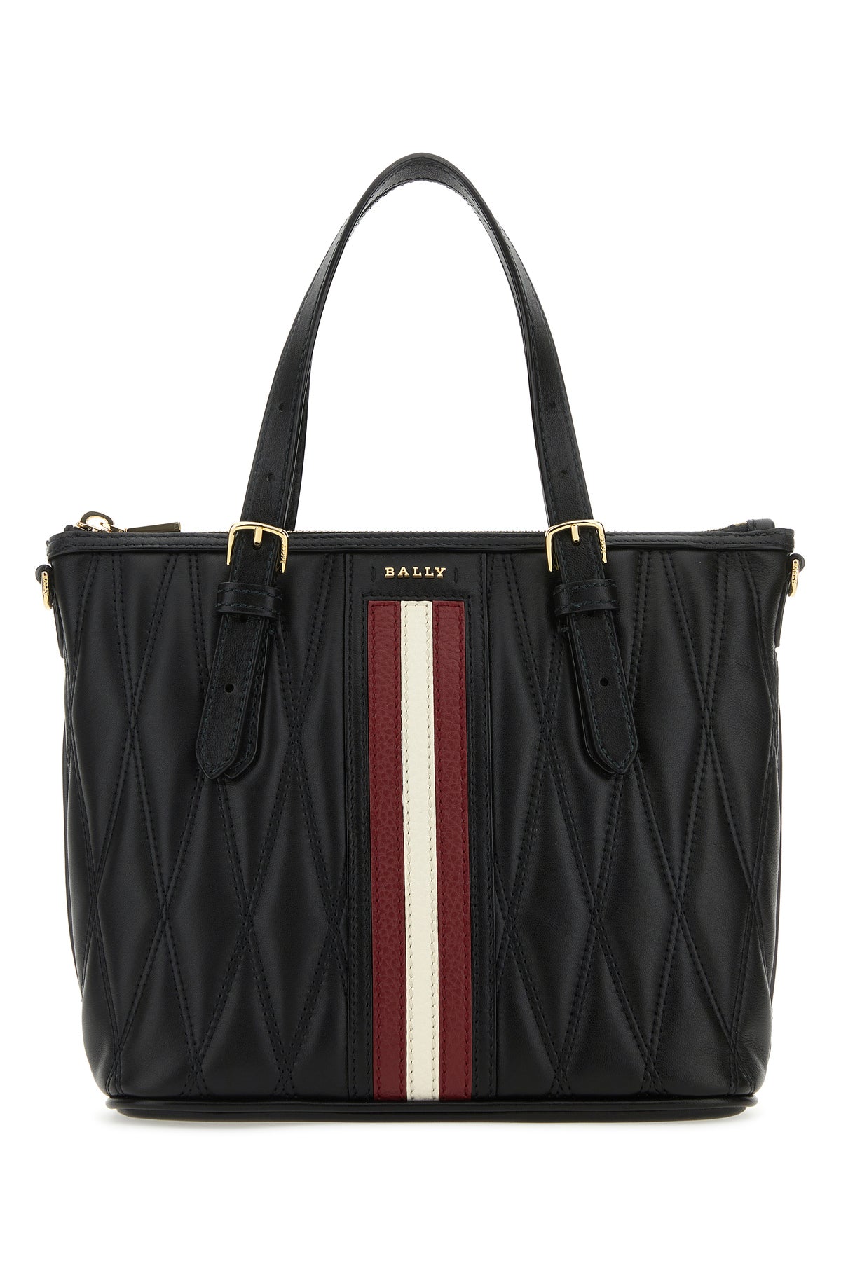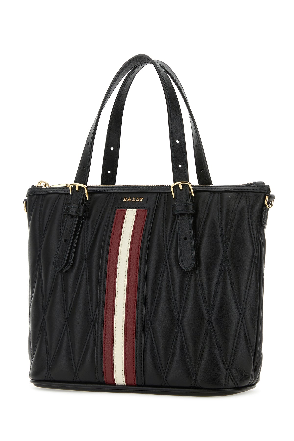 Handbag realized in quilted nappa leather enriched my metal lettering logo and Bally Stripe at the front.