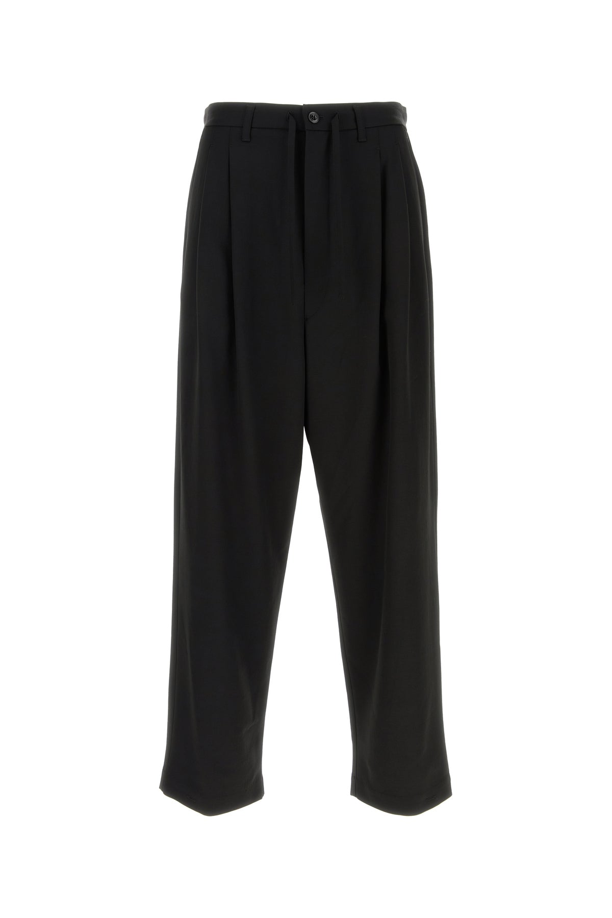 Pant realized in wool blend characterized by inverted pleats.