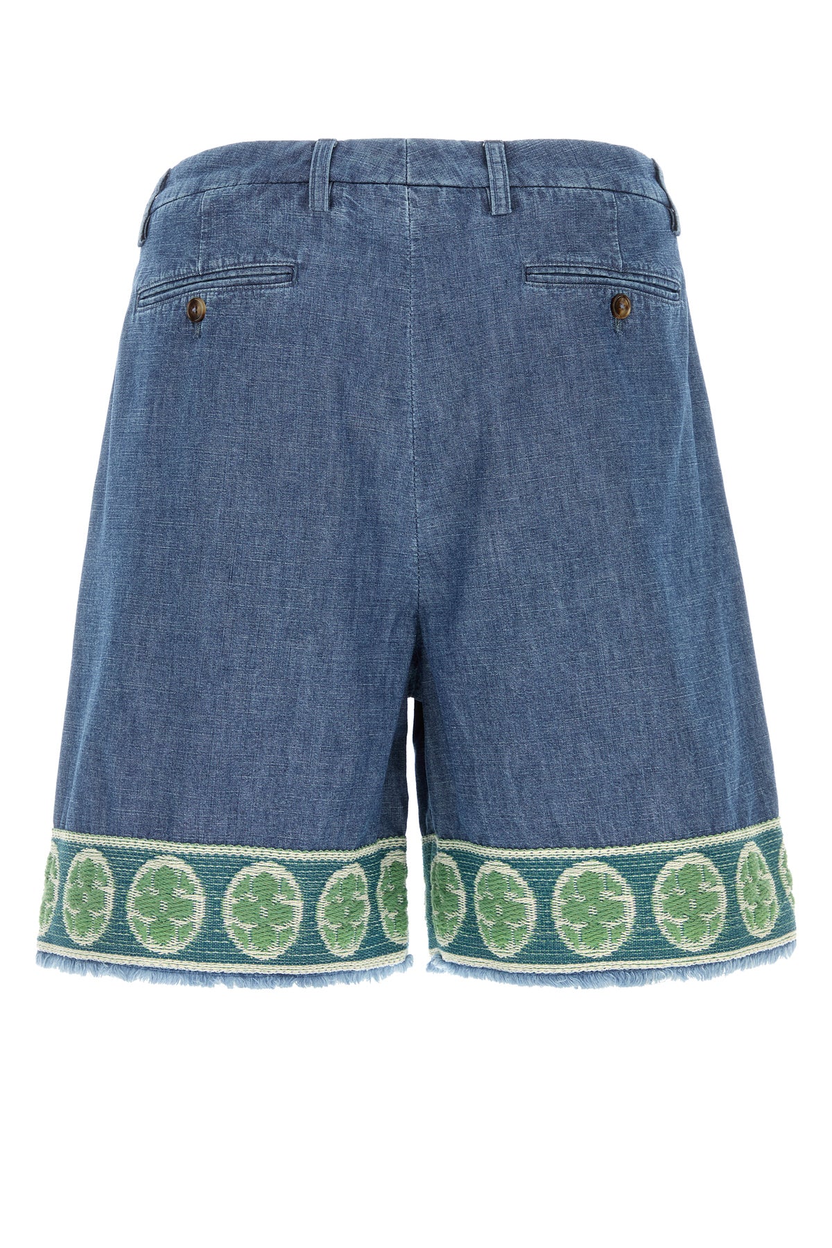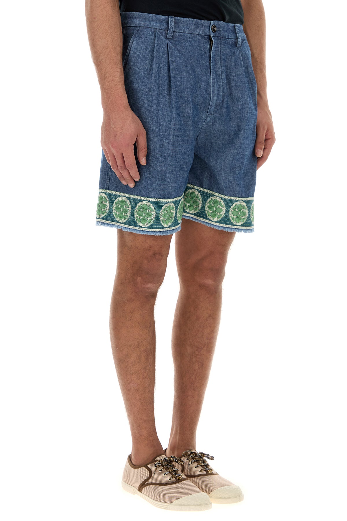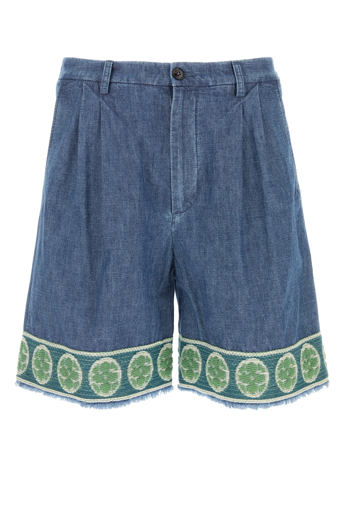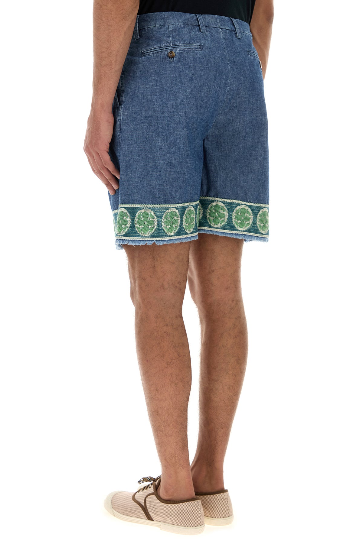 Bermuda shorts realized in pure cotton denim characterized by peculiar embroidery on the hemline.