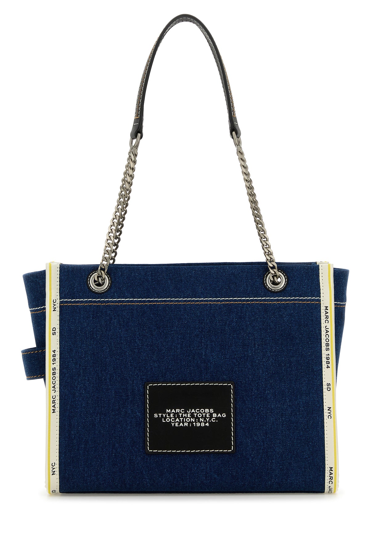 - Two metal chain handles with leather shoulder pad