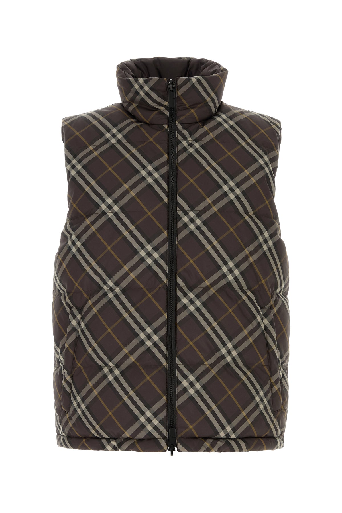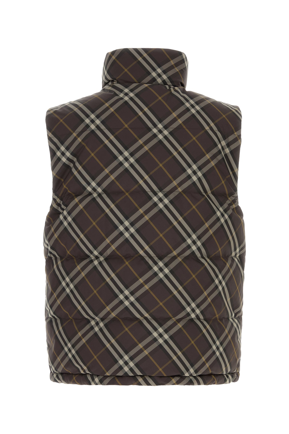 Sleeveless reversible donw jacket realized in quilted polyester characterized by Burberry Check embroidery on the entire surface.