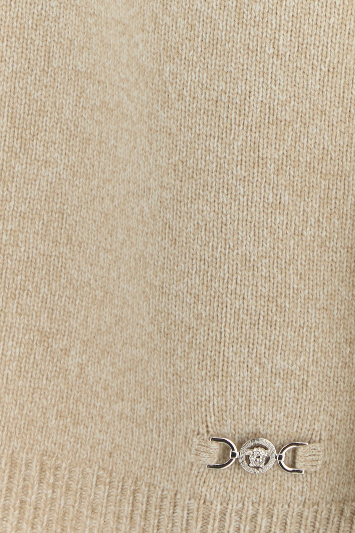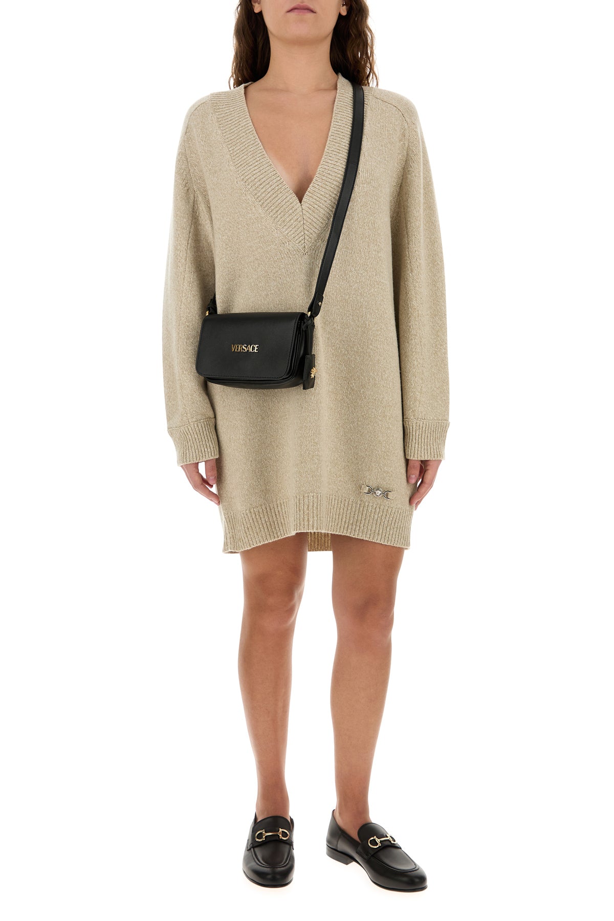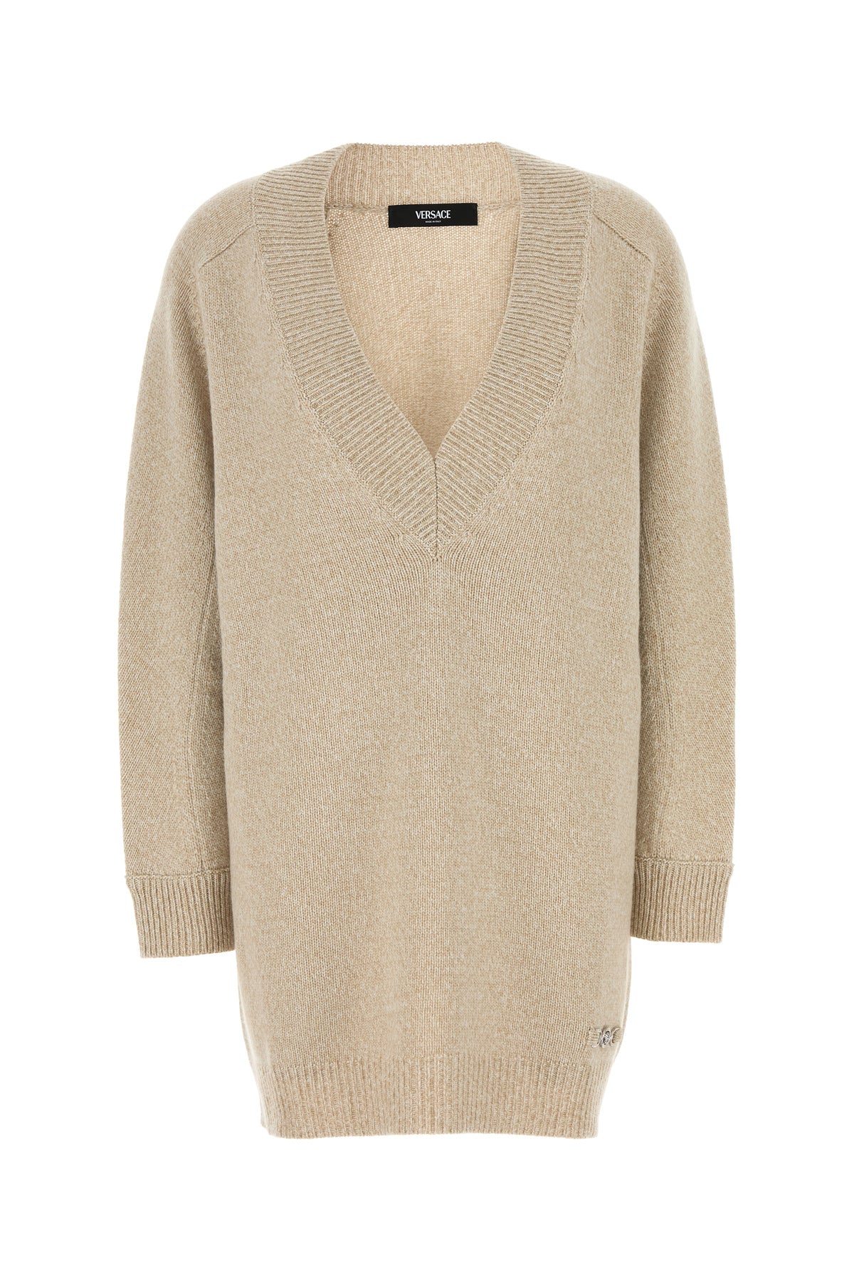 Sweater dress realized in wool and cashmere enriched by Medusa metal detail on the hemline.