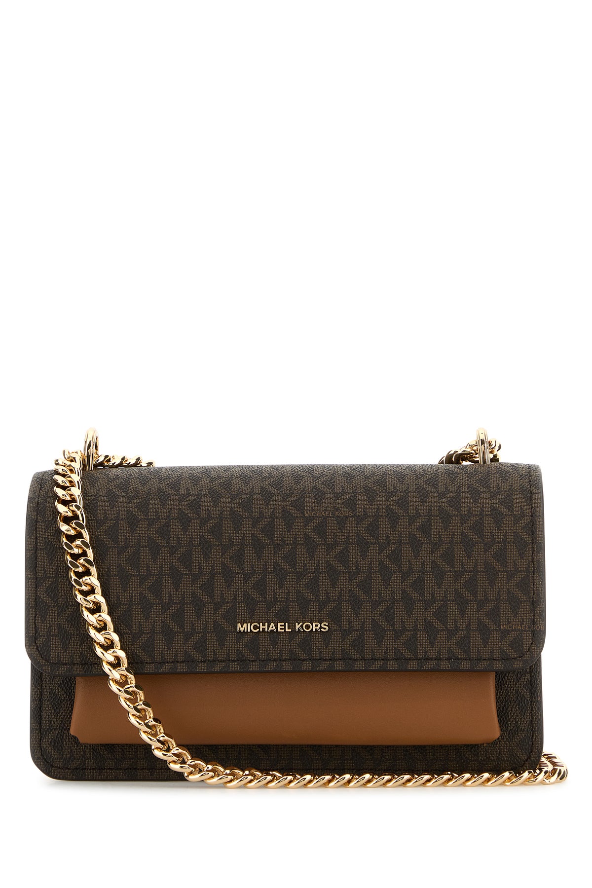 Shoulder bag realized in grained coated canvas and smooth leather characterized by printed logo on the entire surface enriched by metal lettering logo at the front.