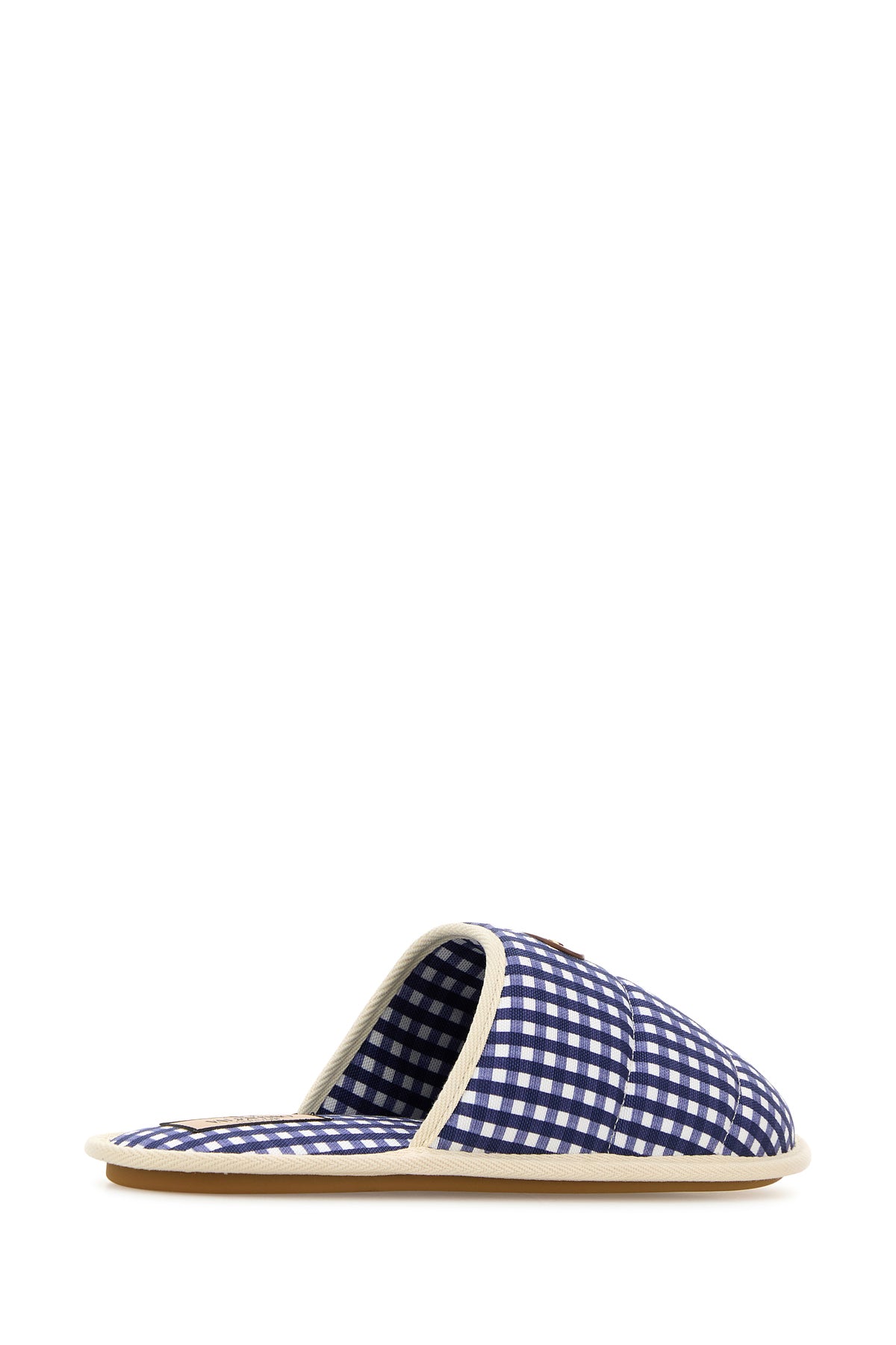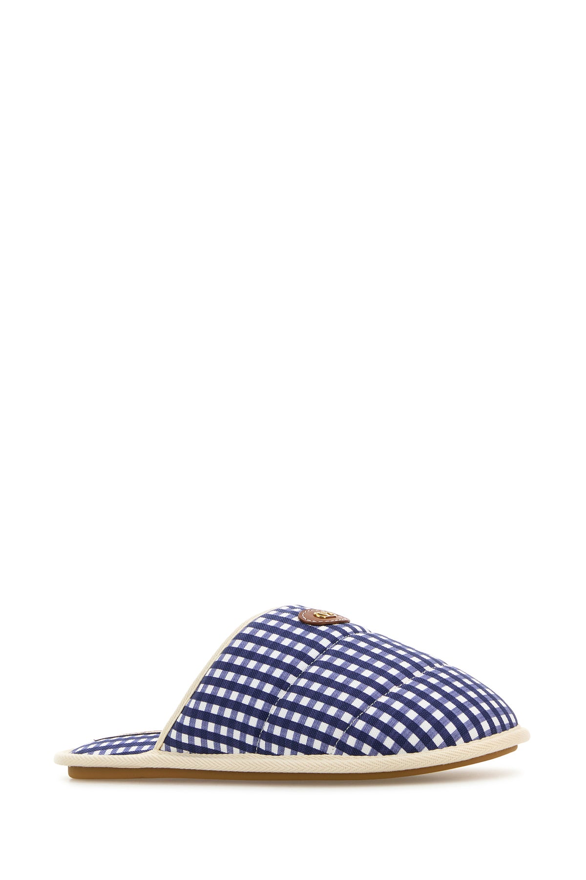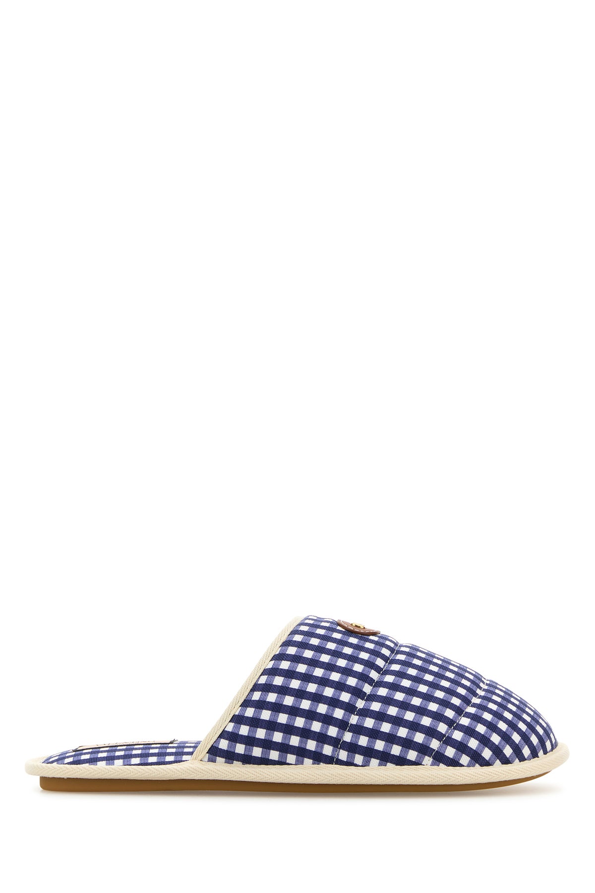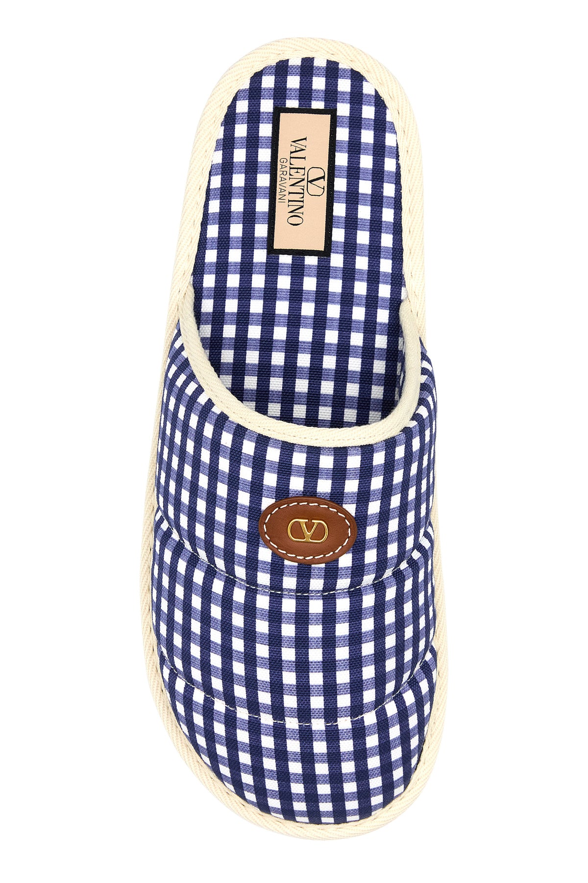 Slippers realized in quilted fabric characterized by check print on the entire surface enriched by leather patch with metal VLogo detail at the front.