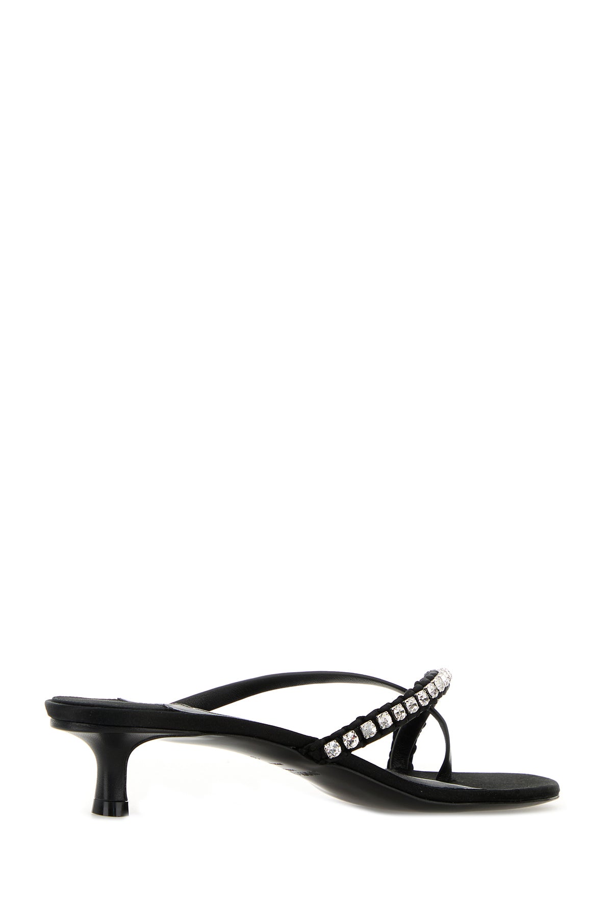Mules realized in nappa leather and satin enriched by rhinestones on the instep.