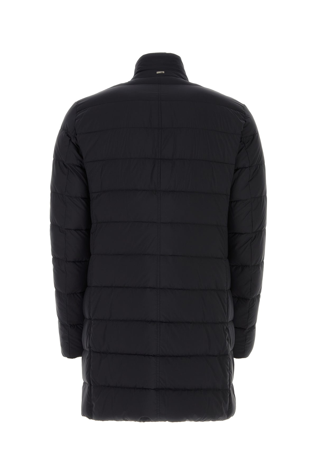 Padded jacket realized in quilted nylon enriched by logoed metal plate at the back.