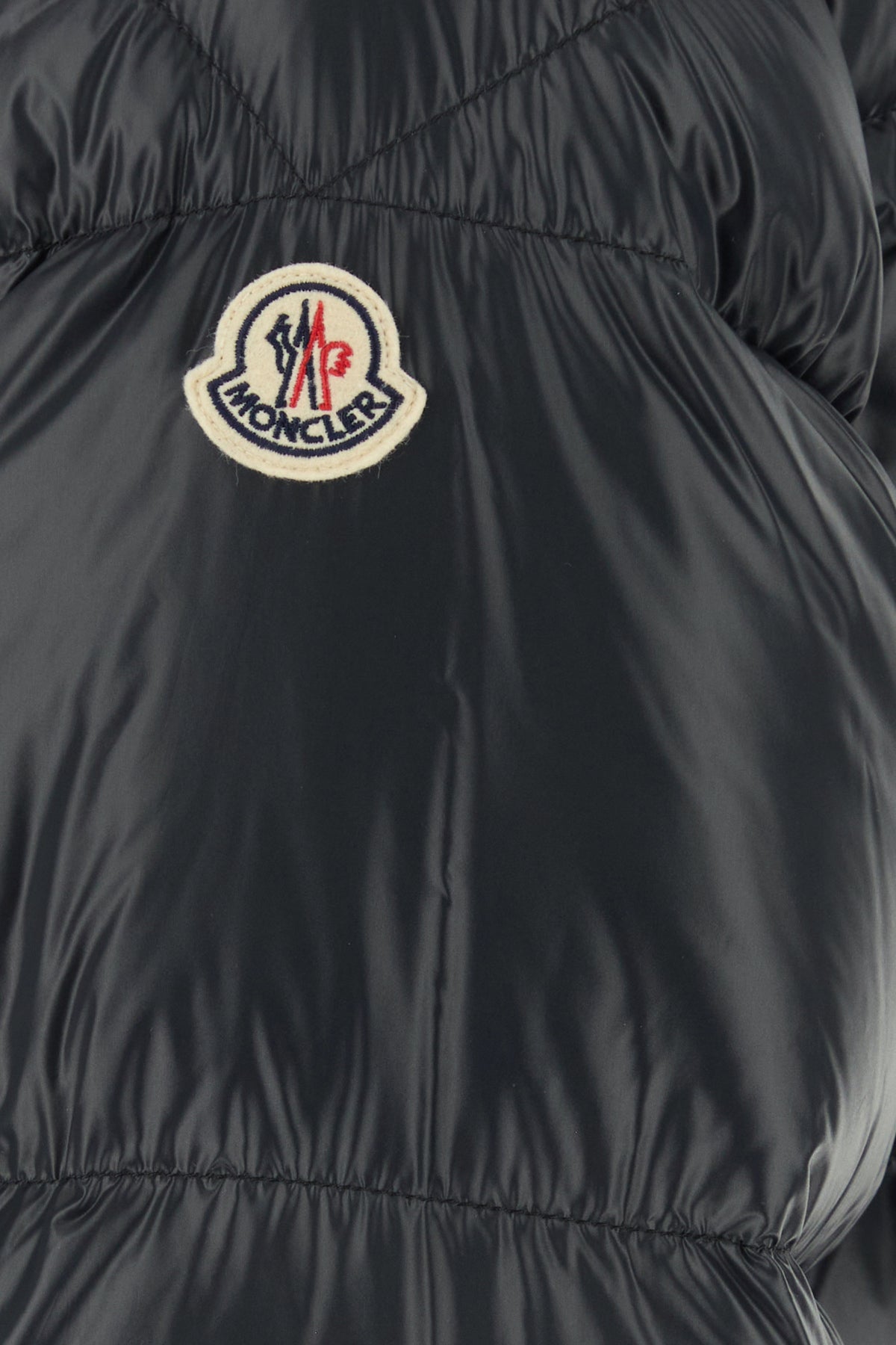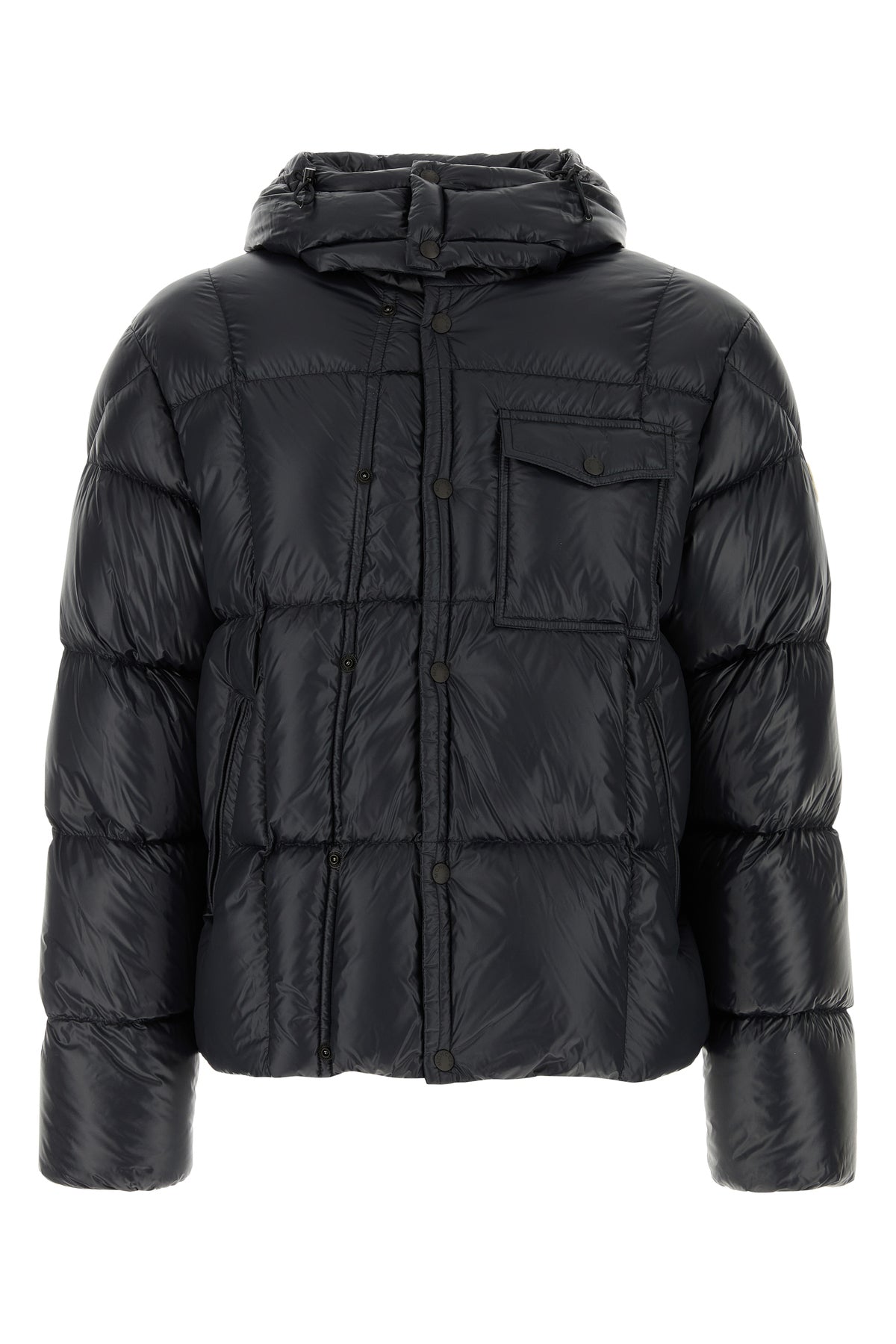 Down jacket realized in quilted nylon enriched by contrasting logoed patch on the sleeve.