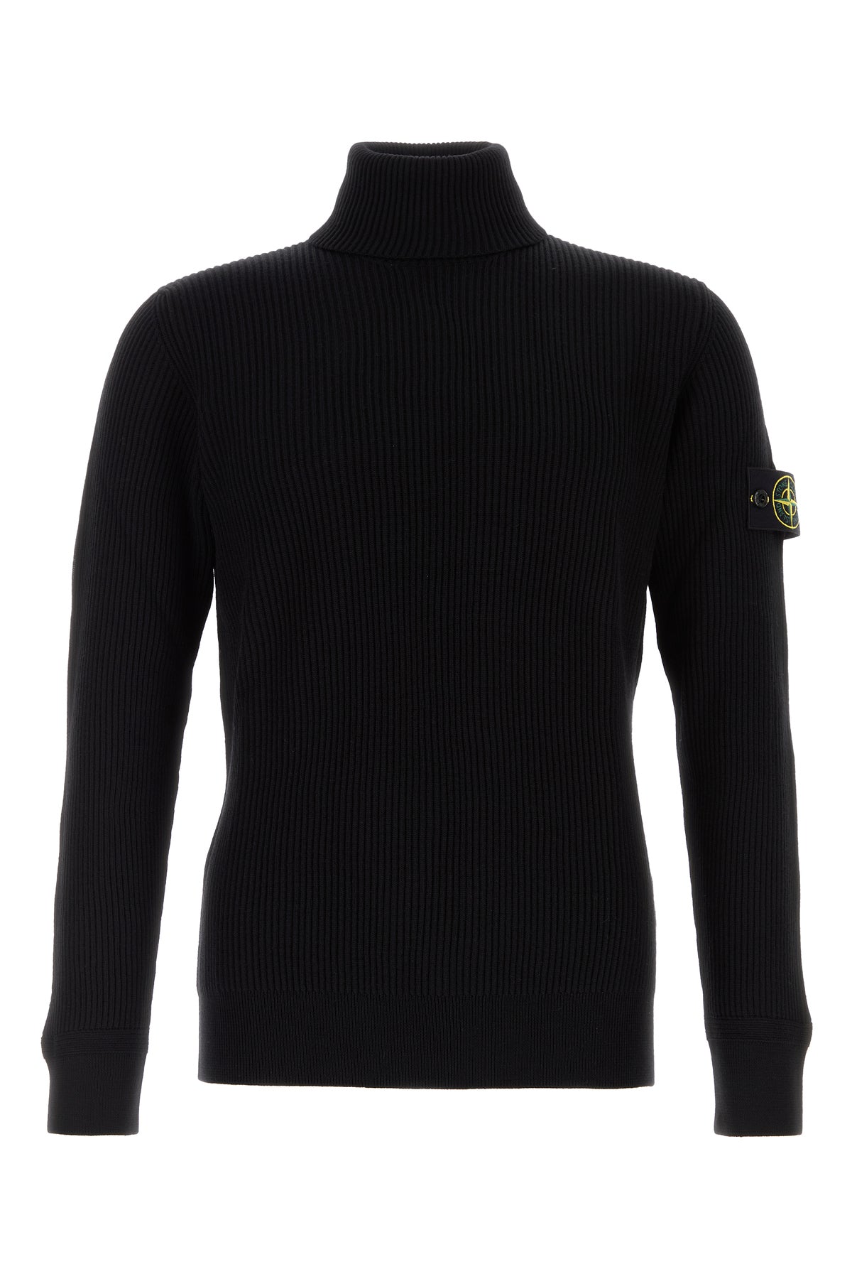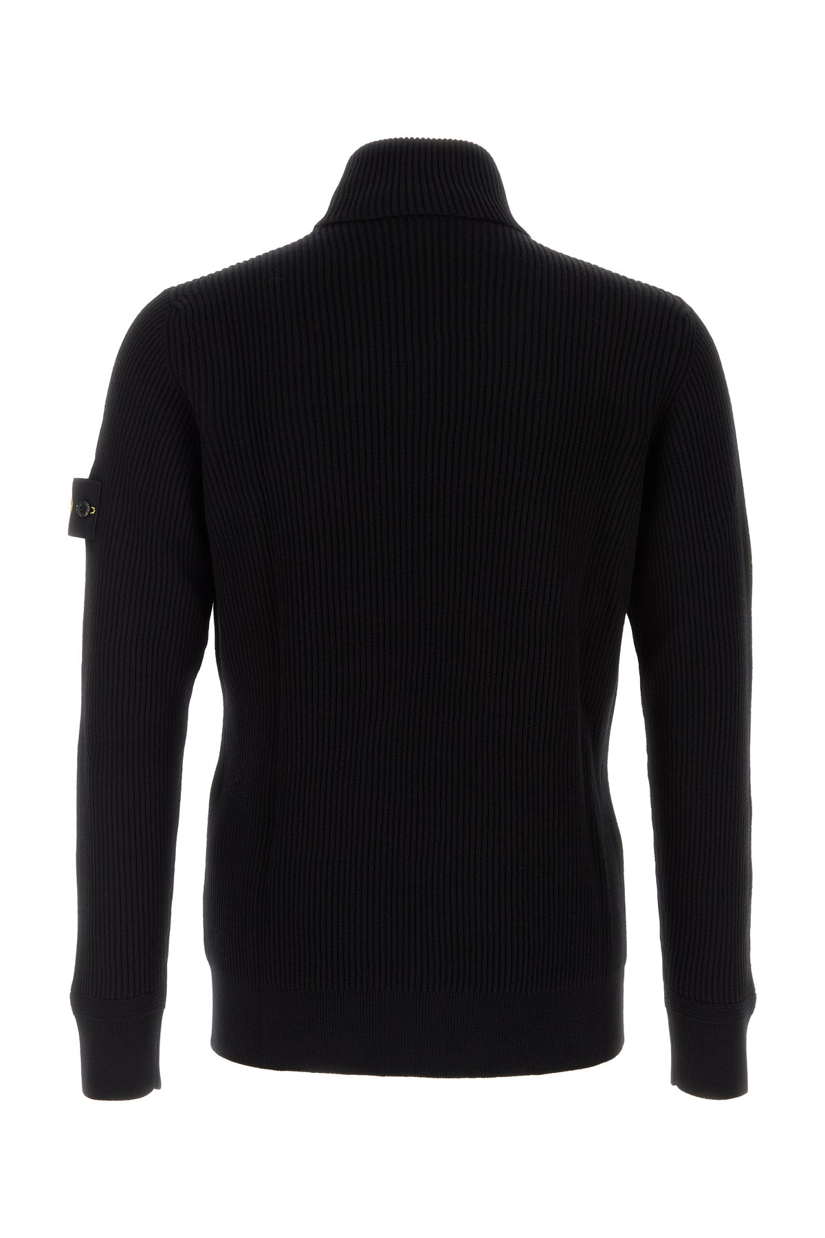 Sweater realized in pure ribbed virgin wool enriched by detachable logoed label on the sleeve.