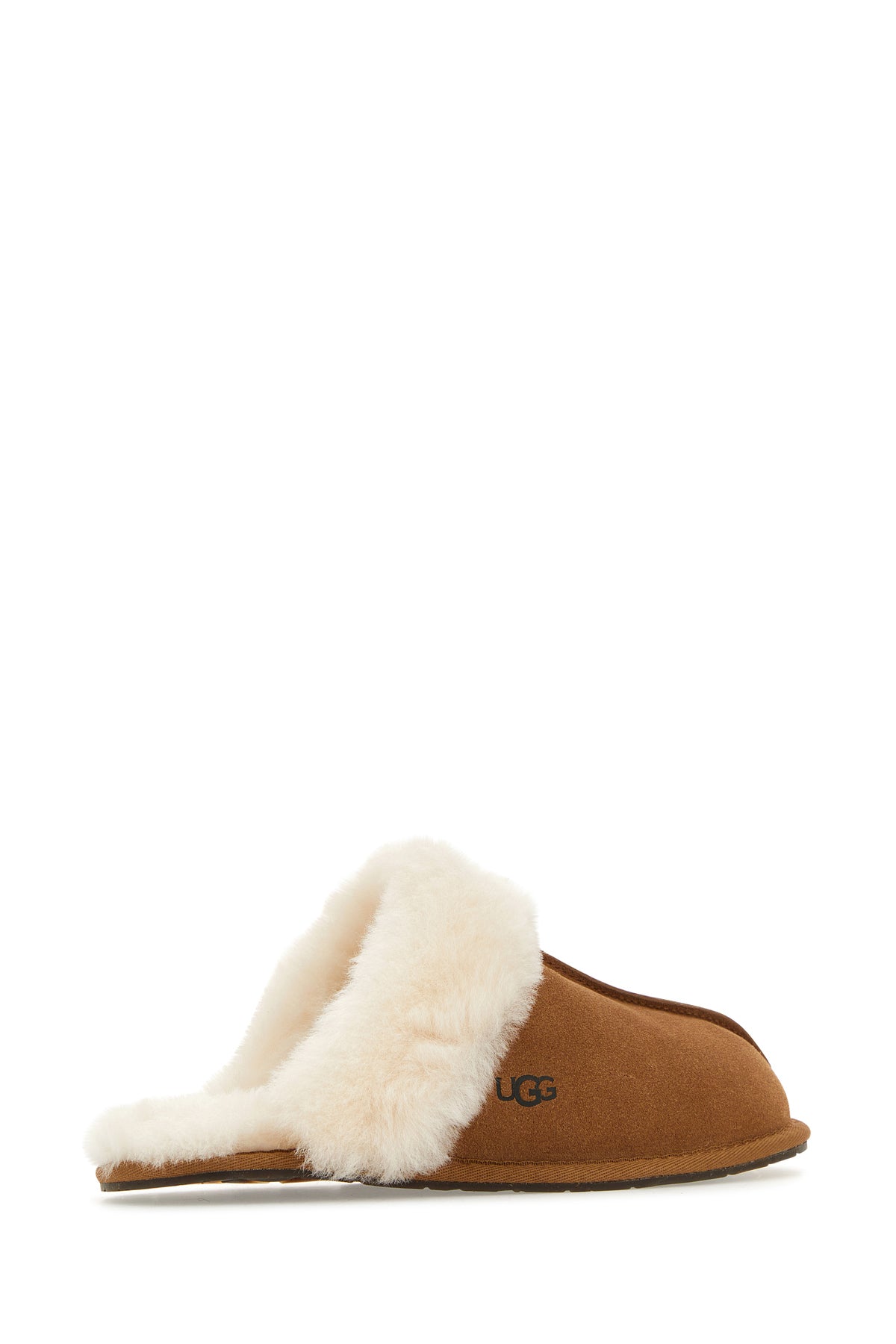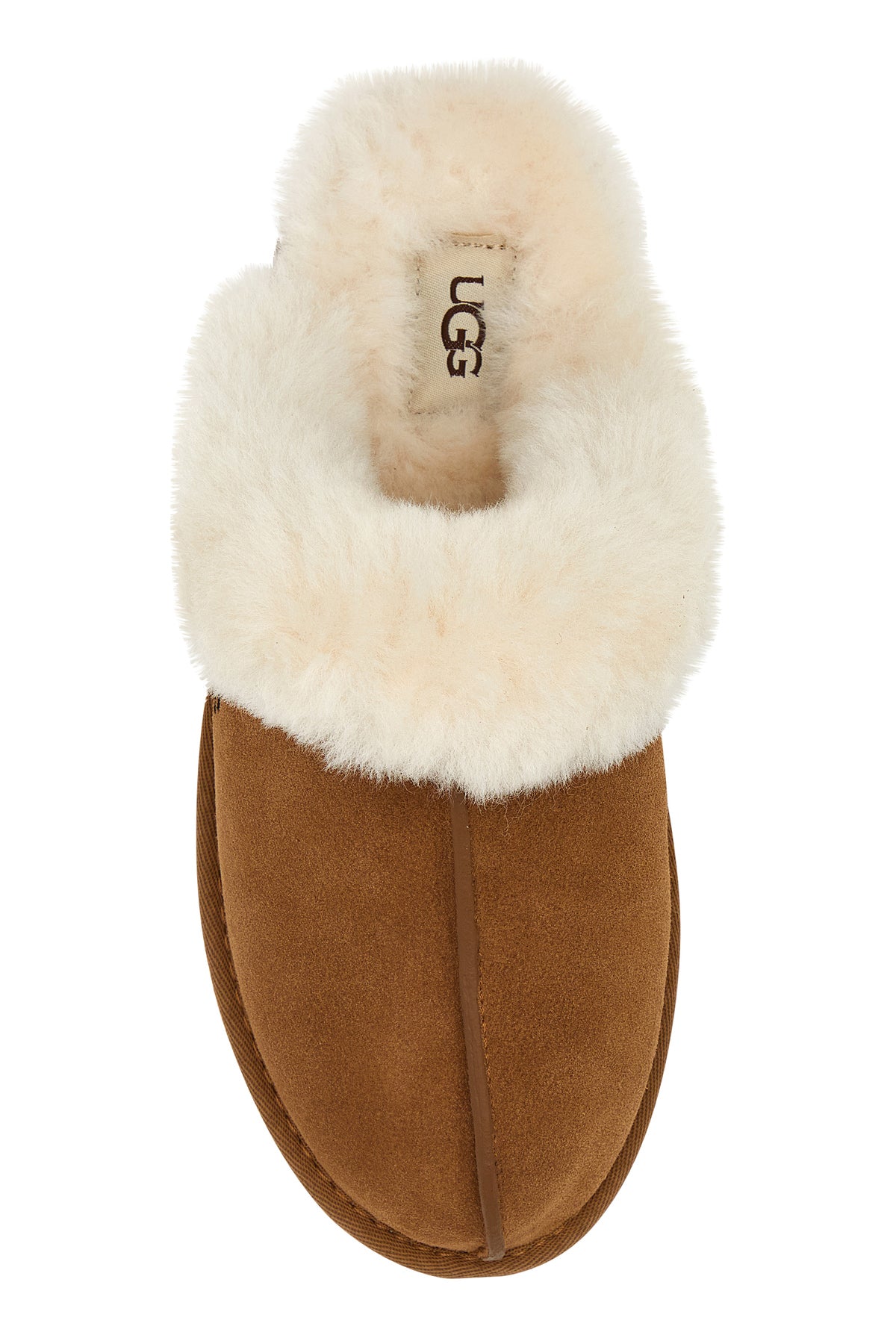 Slippers realized in suede with contrasting shearling insert characterized by printed logo on the side.