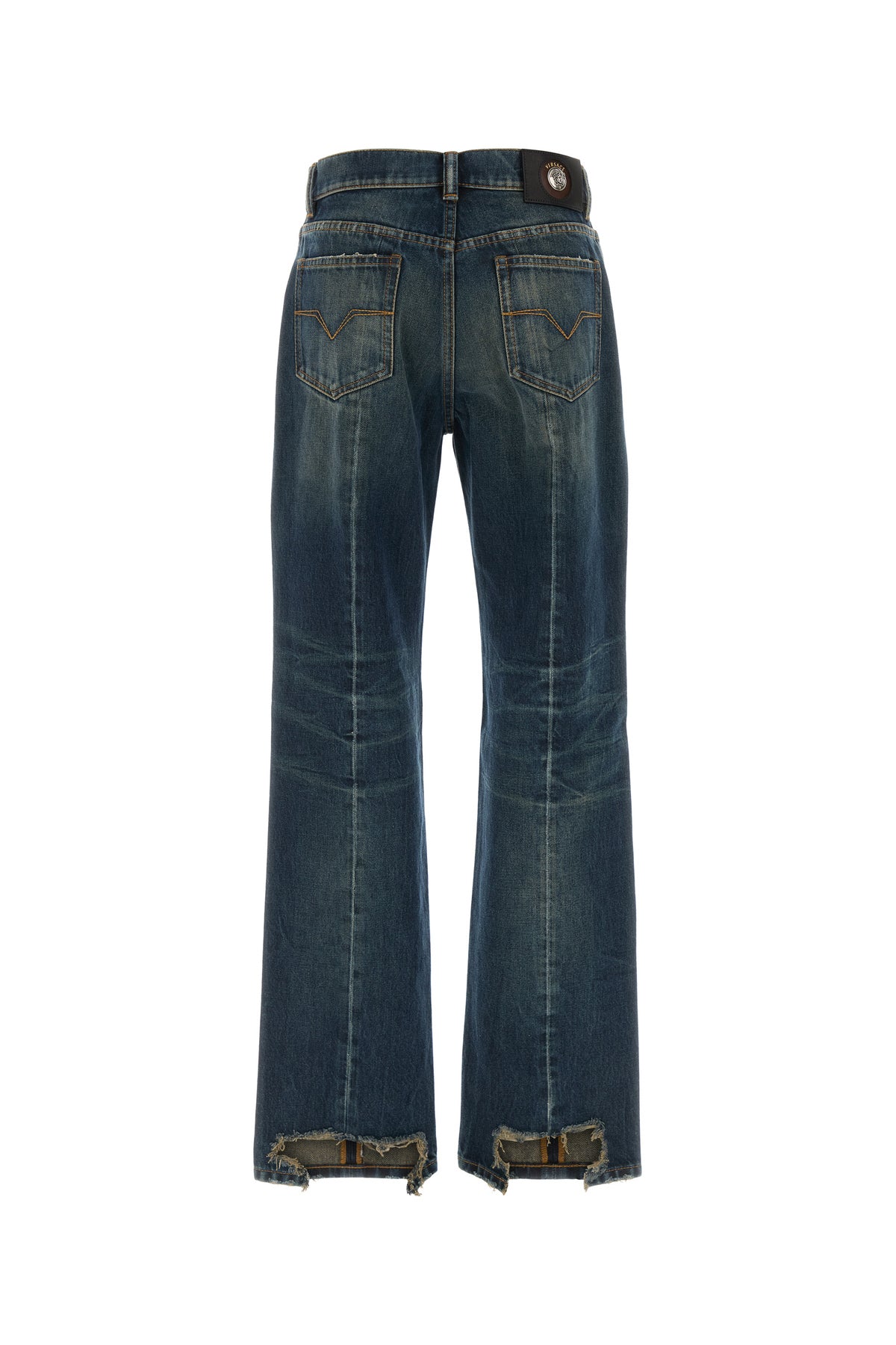 Jeans realized in vintage-effect stonewashed pure cotton denim enriched by Versace Logo label with iconic Medusa Head at the back.