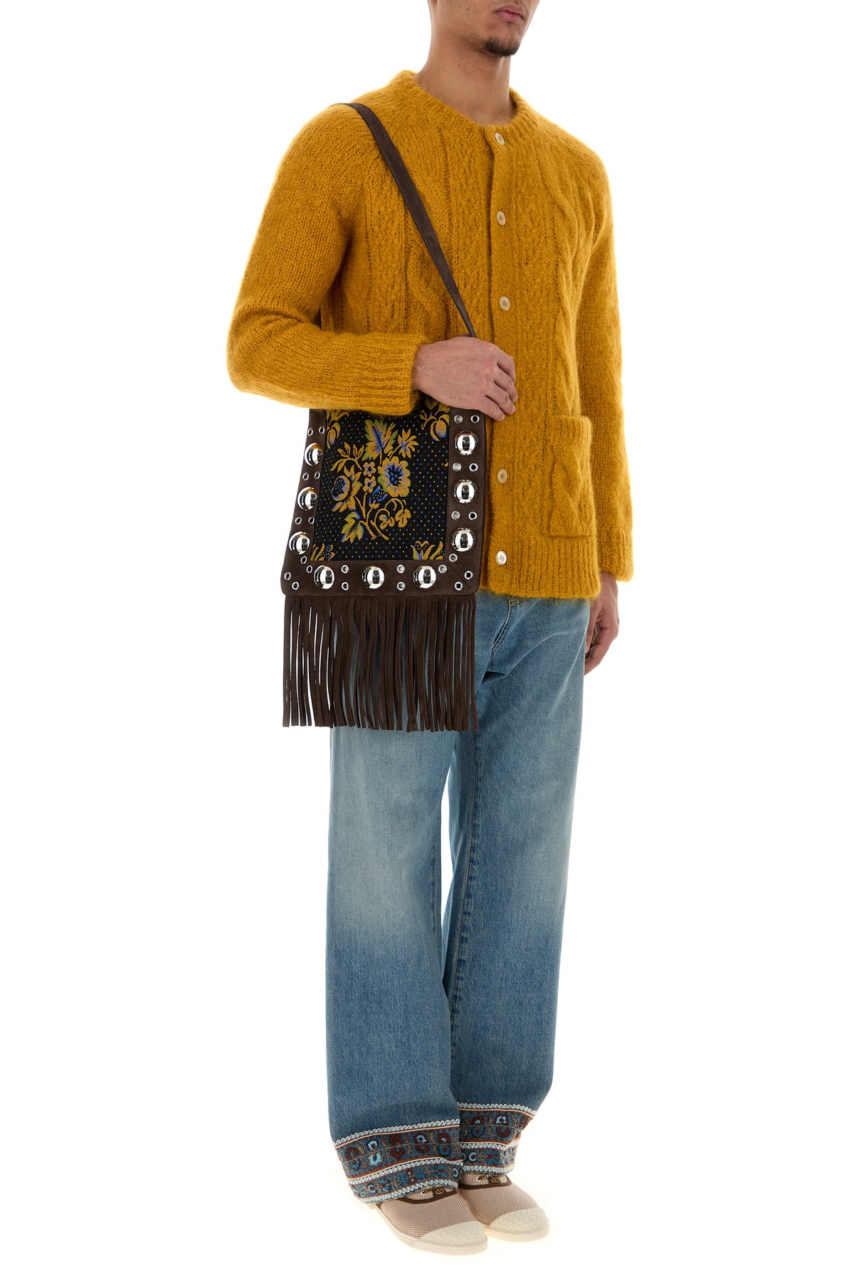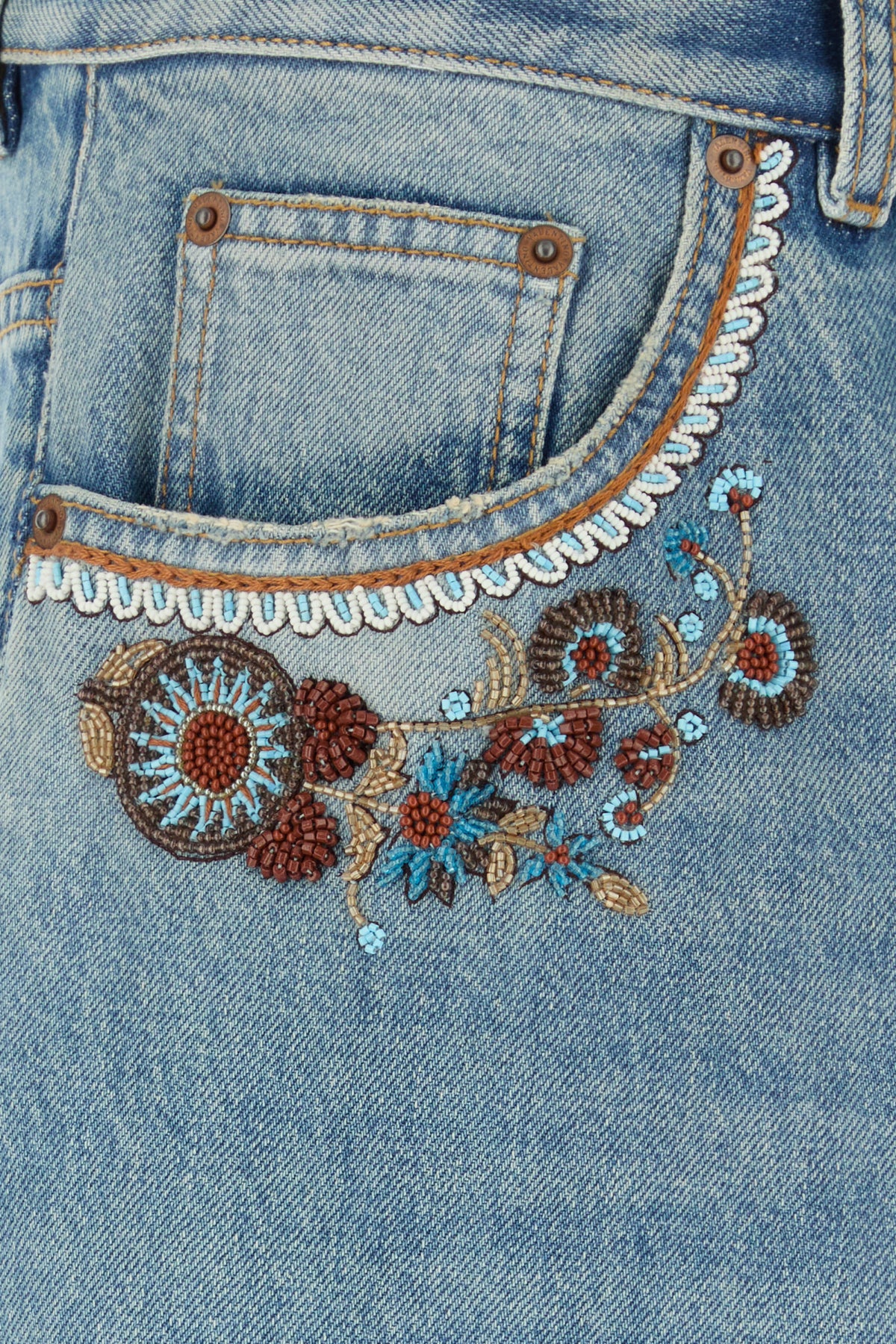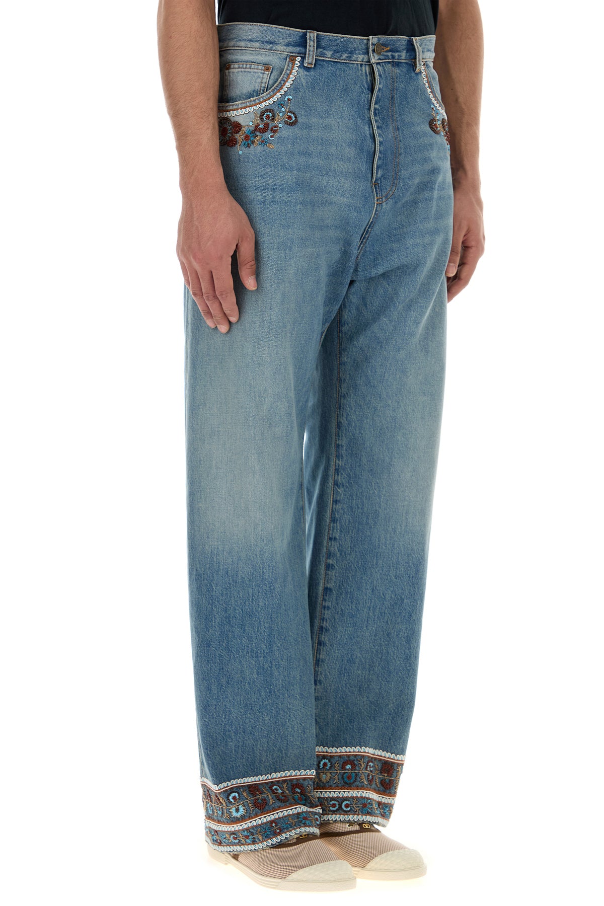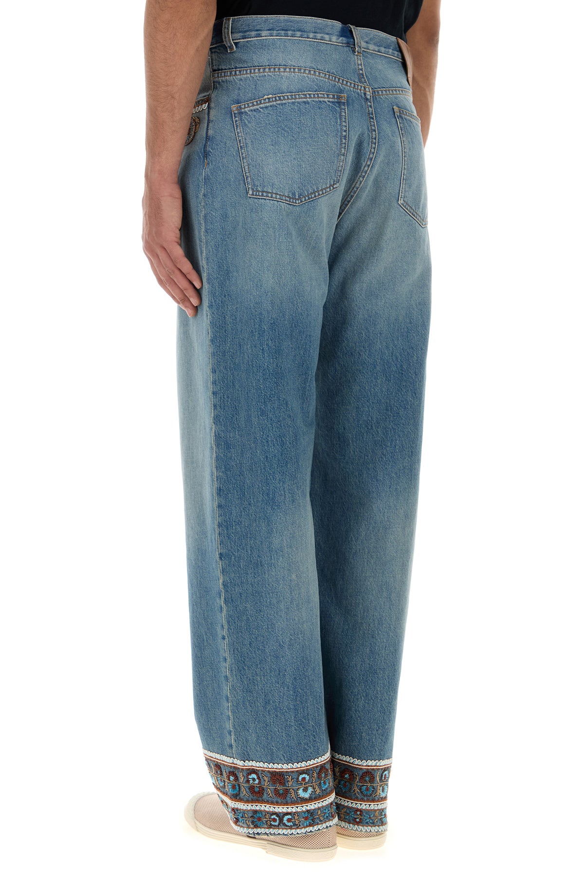 Jeans realized in stonewashed pure cotton denim characterized by peculiar embroidery at the top and on the hemline.