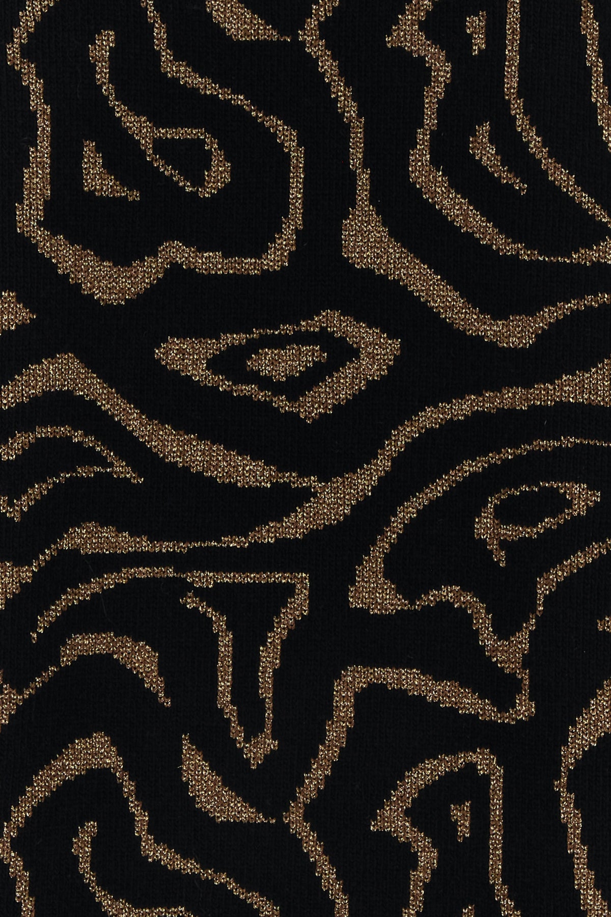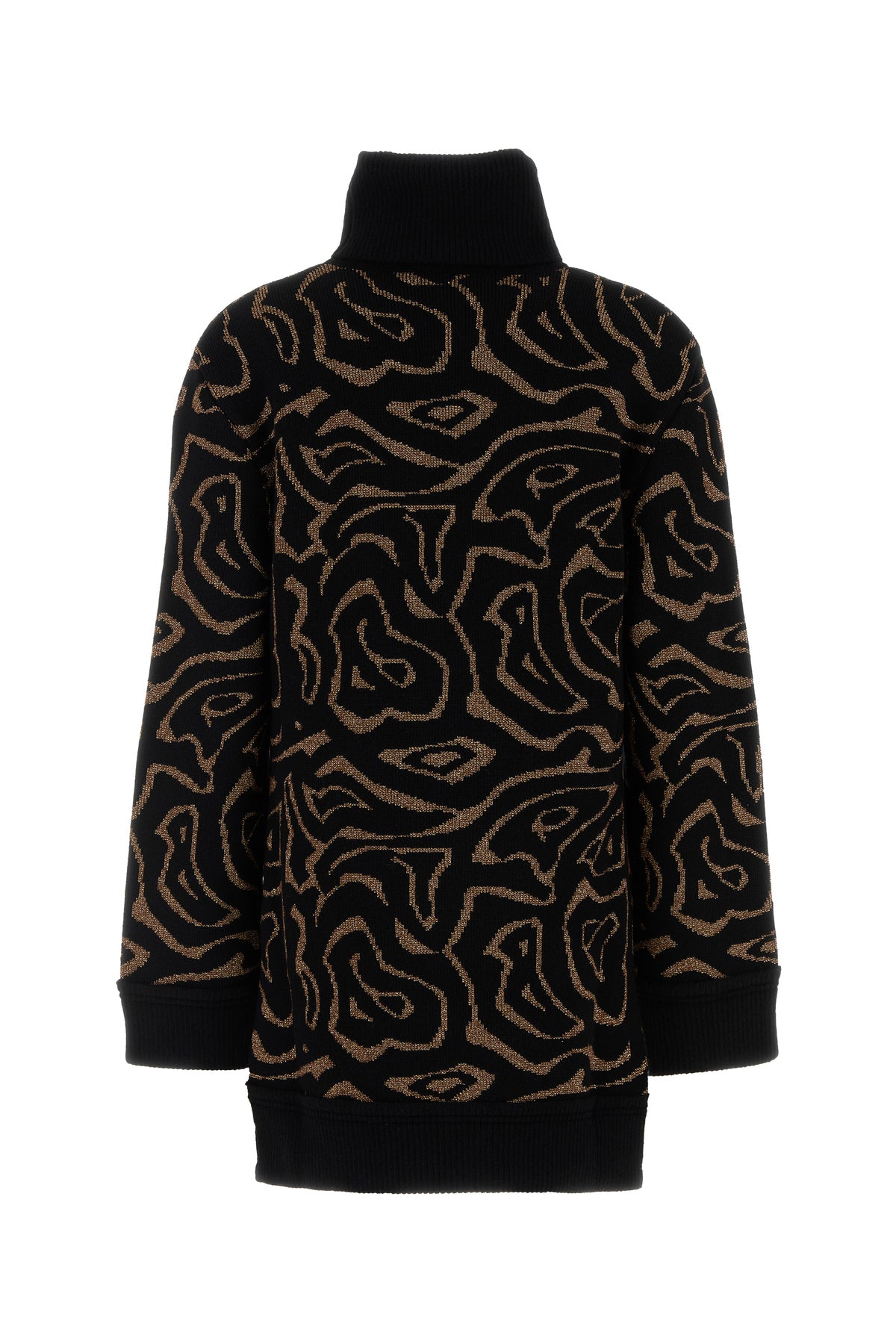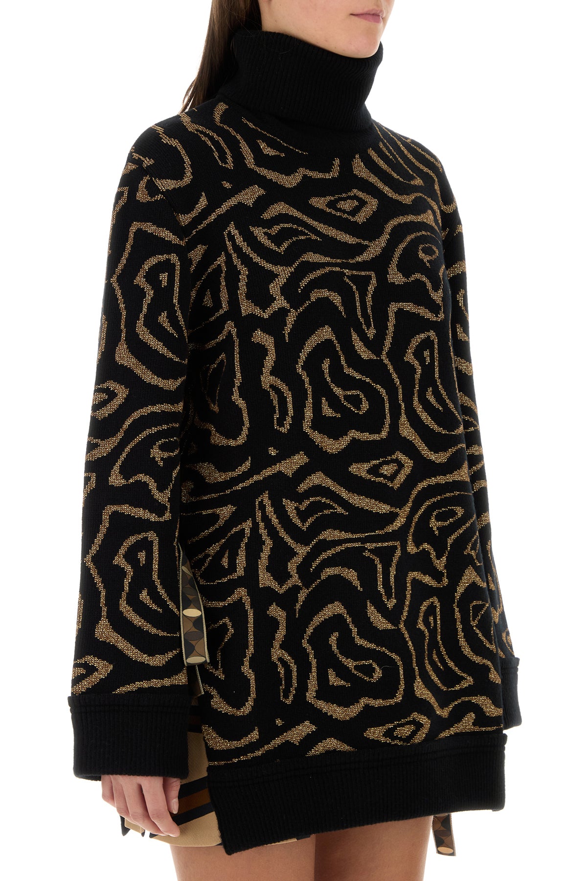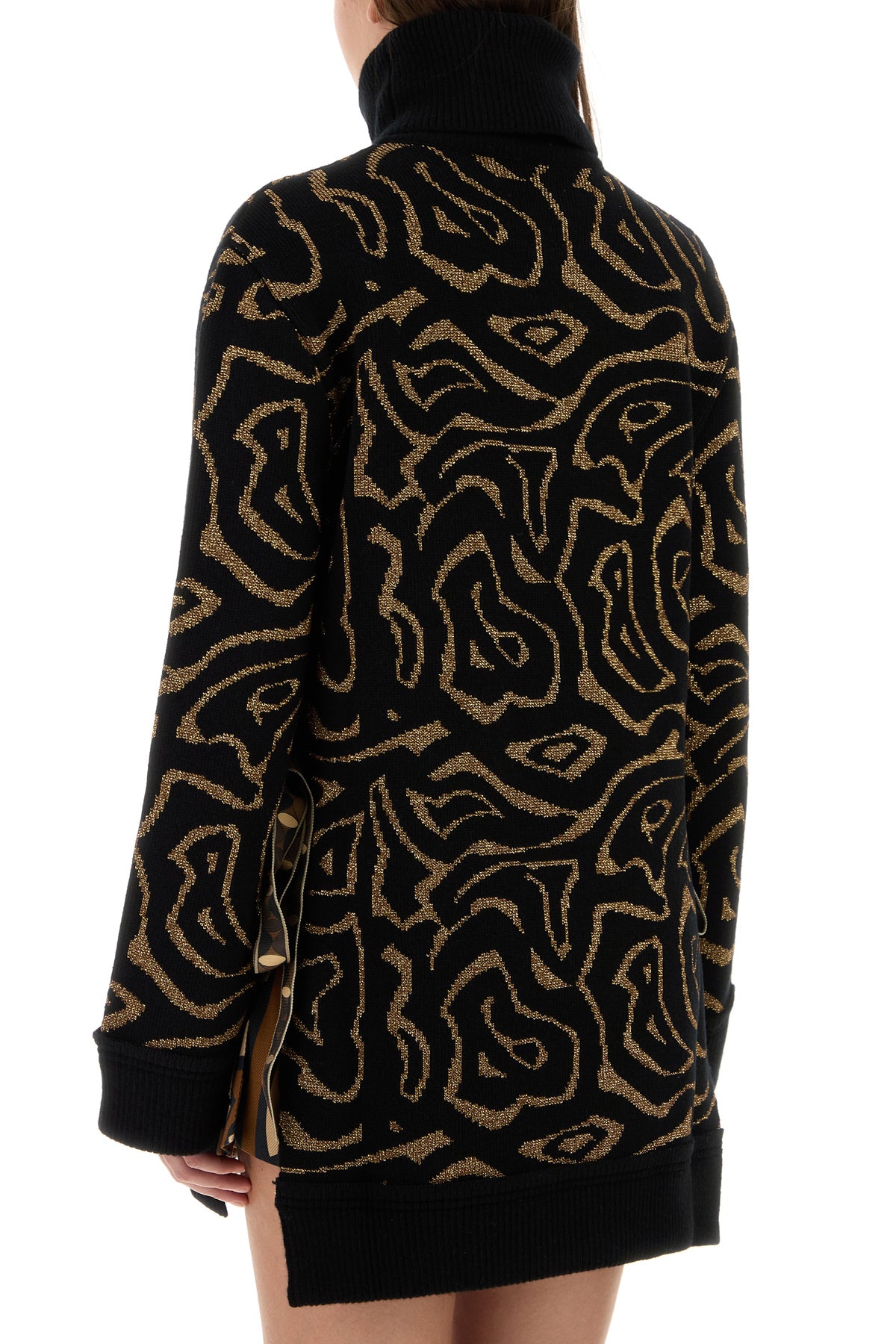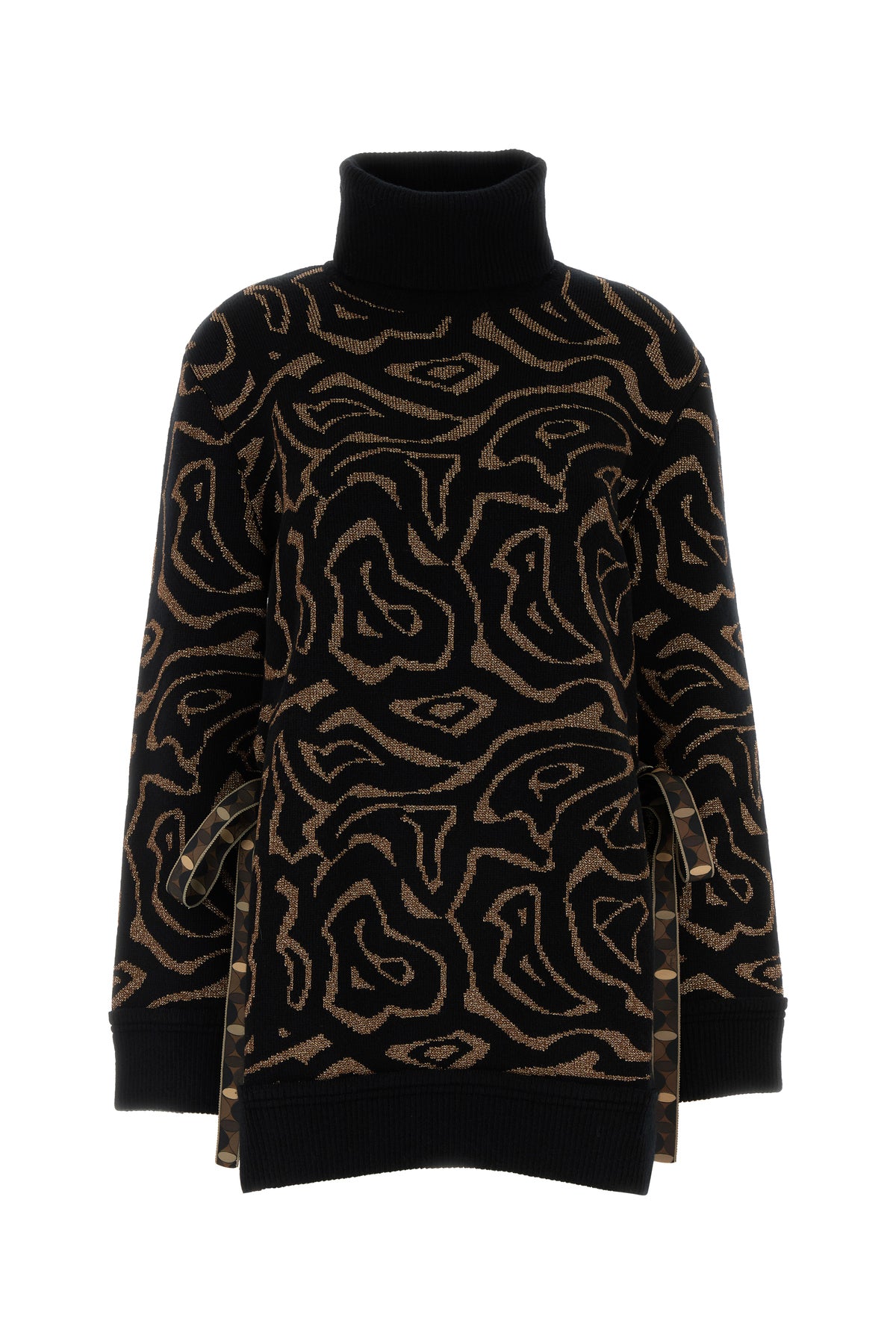 Oversize sweater realized in polyester blend with lurex threads characterized by Labyrinth embroidery on the entire surface enriched by ribbons to tie on the sides.