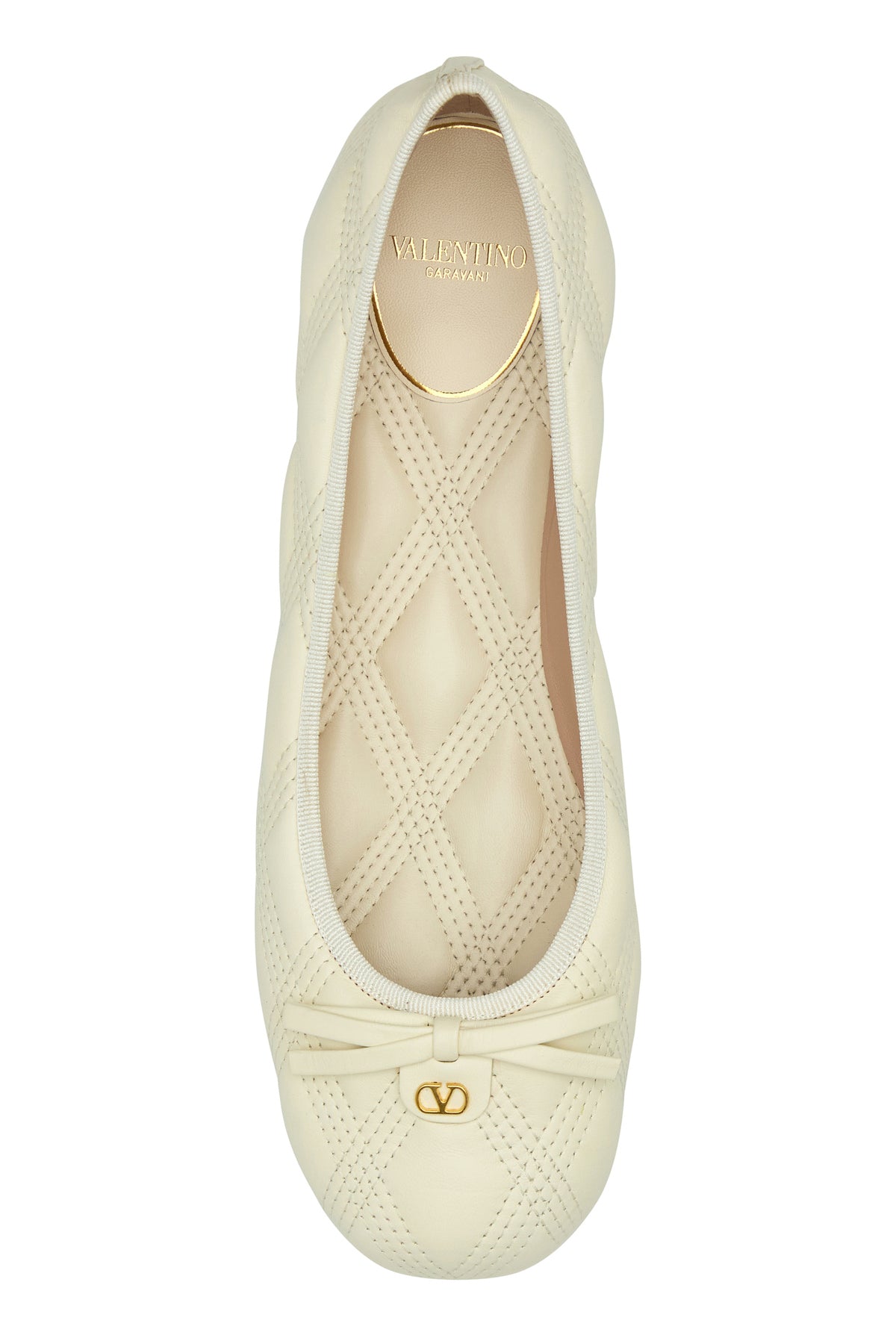 Ballerinas realized in quilted leather enriched by metal VLogo detail and decorative tonal leather bow at the front.