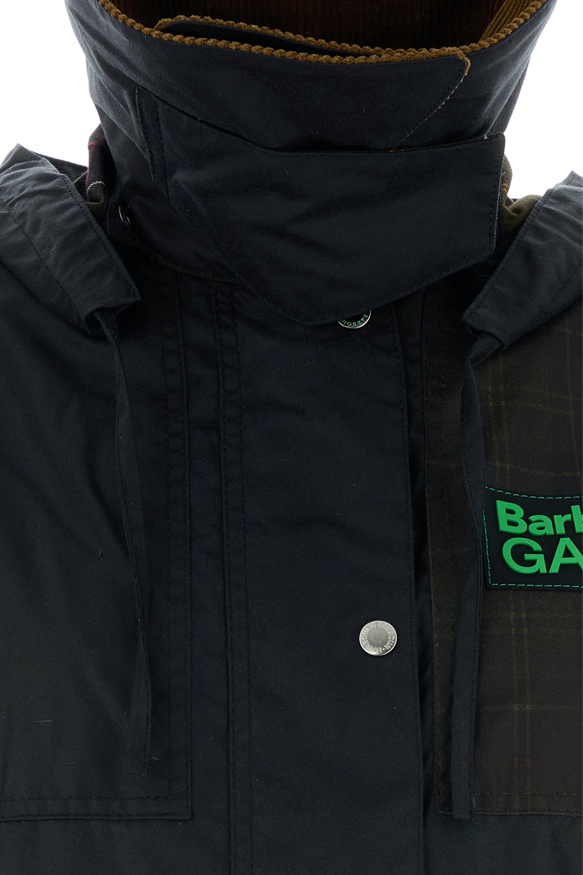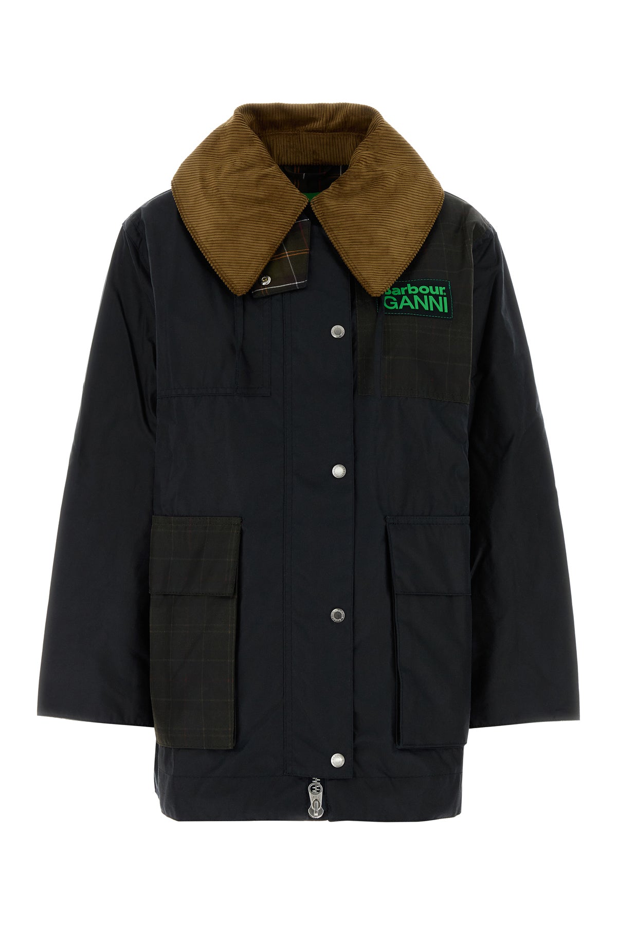 Jacket realized in coated pure cotton with tartan motif inserts enriched by Barbour Ganni patch on the chest.