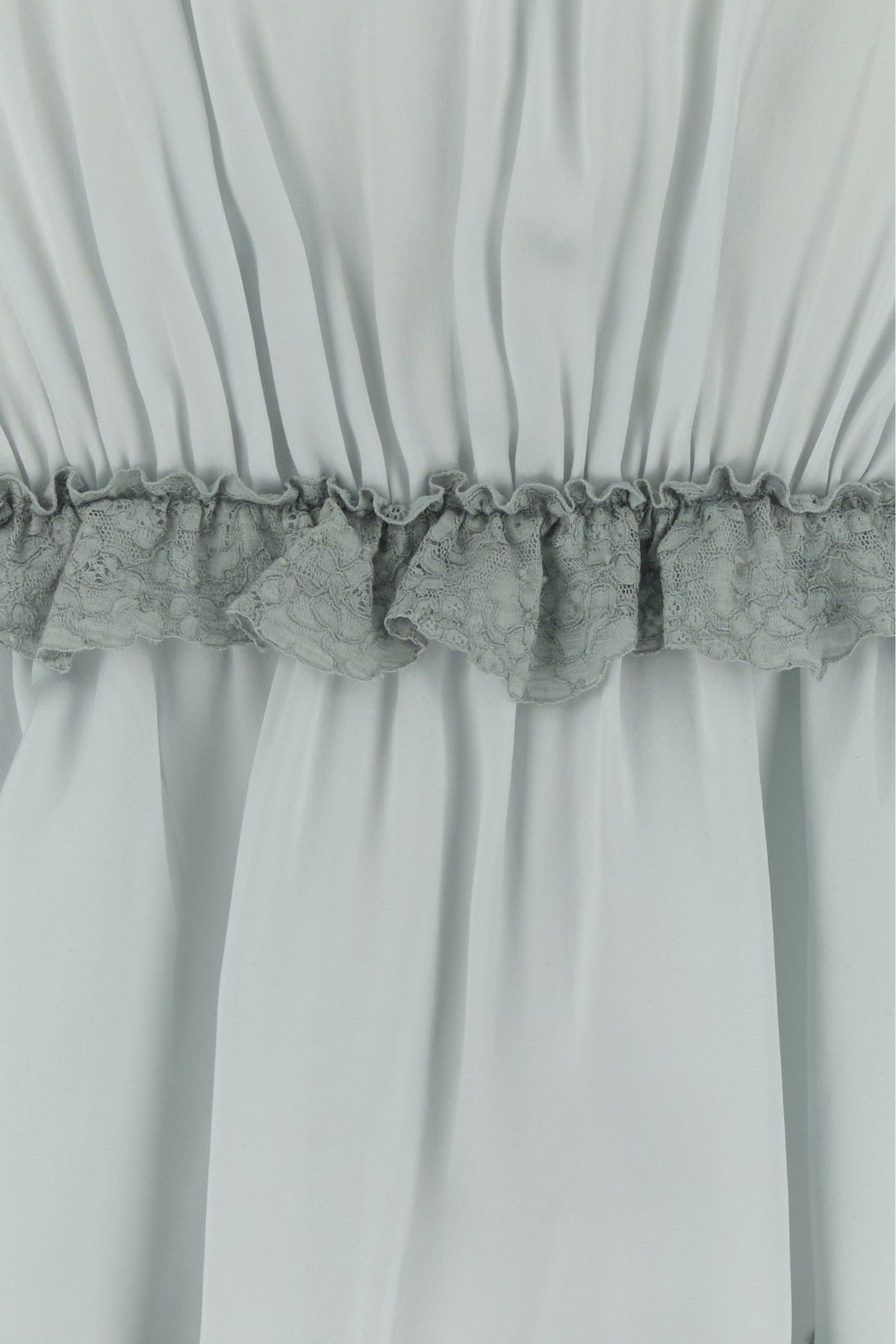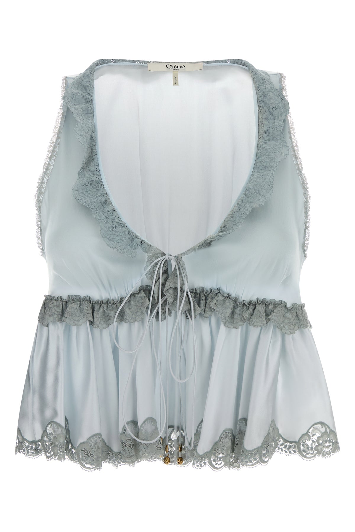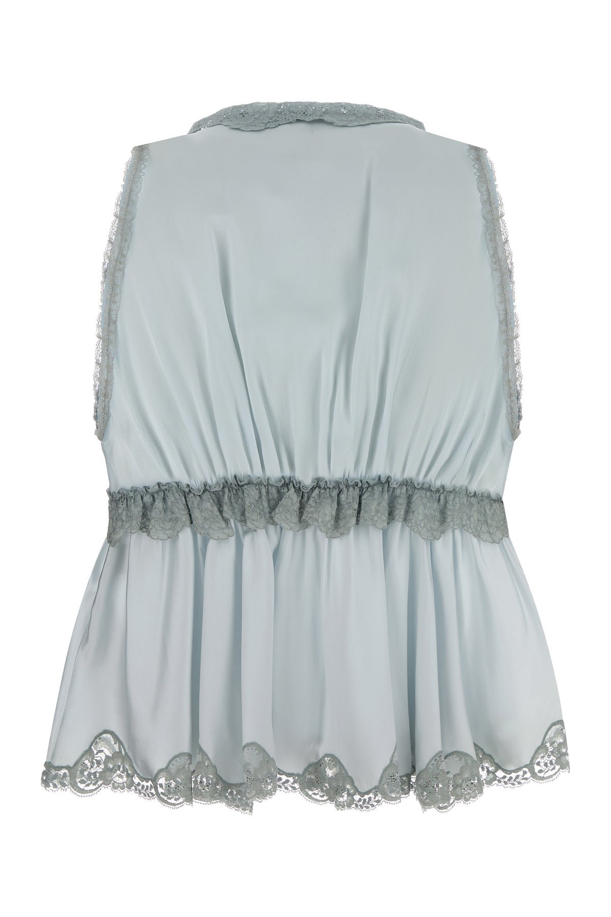 Top realized in pure silk satin enriched by tonal lace inserts on the trimmings.
