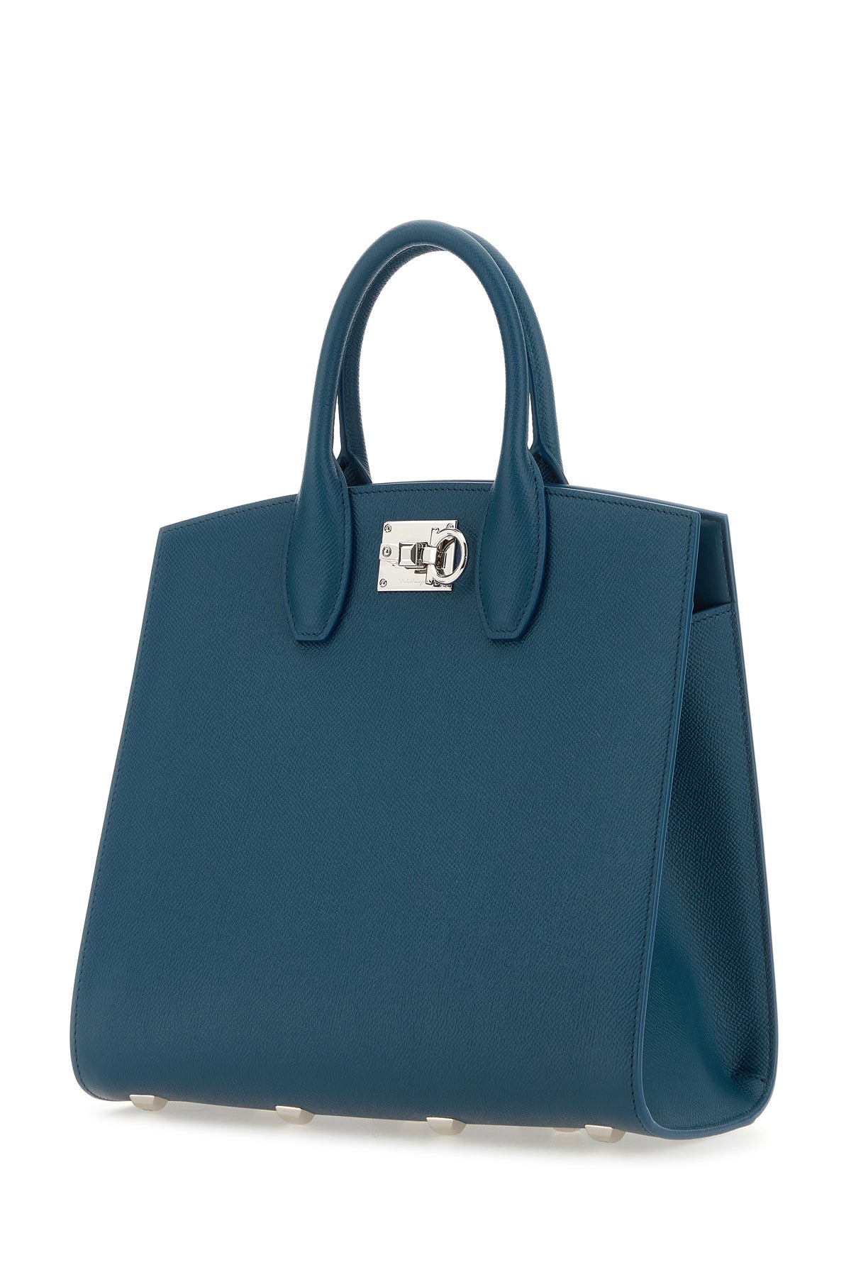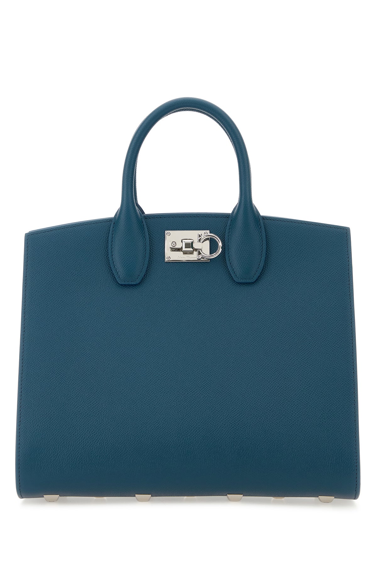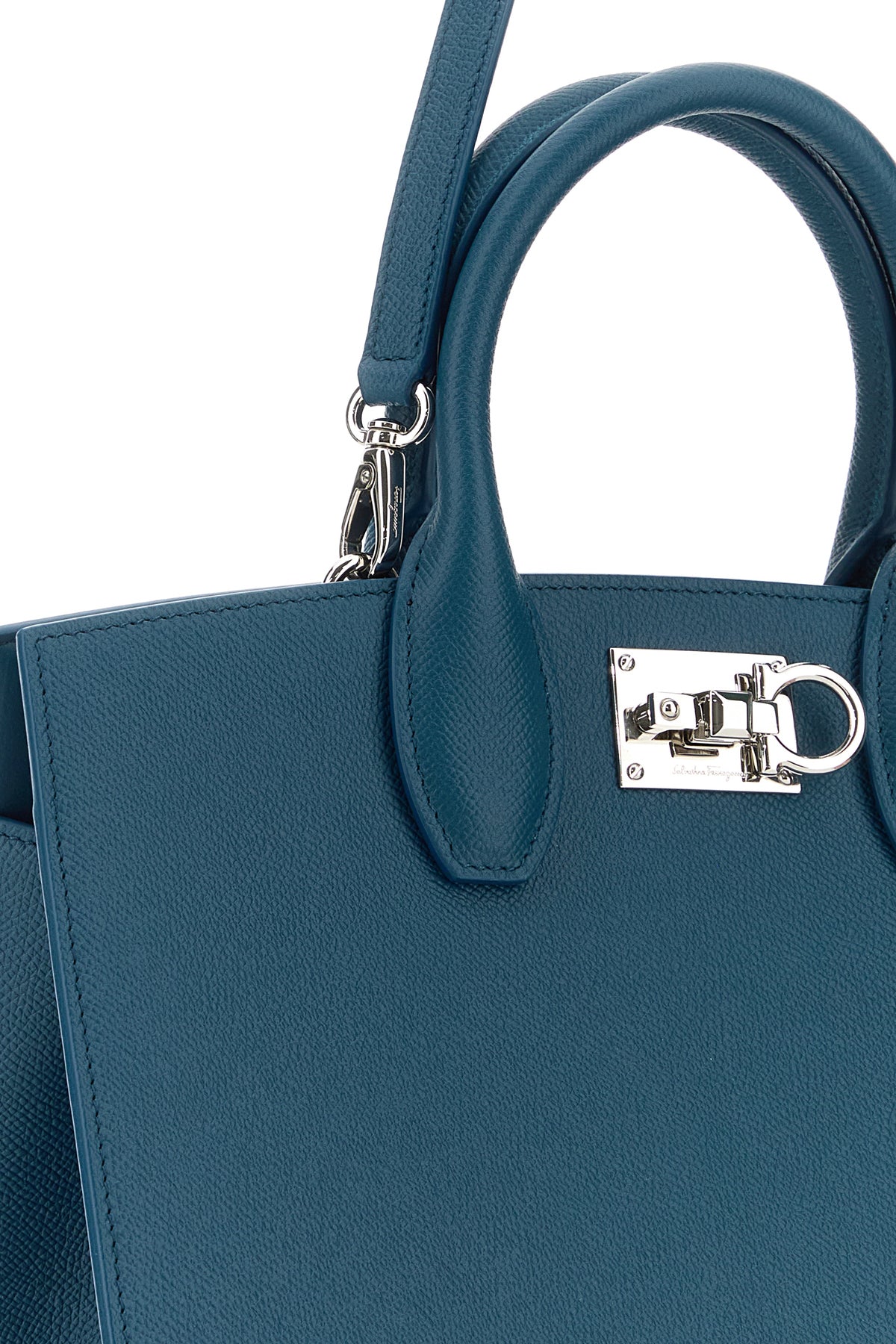 Handbag released in pebble calf leather characterized by Gancini snap-fit closure.