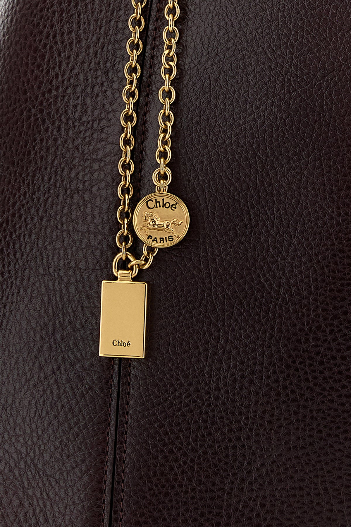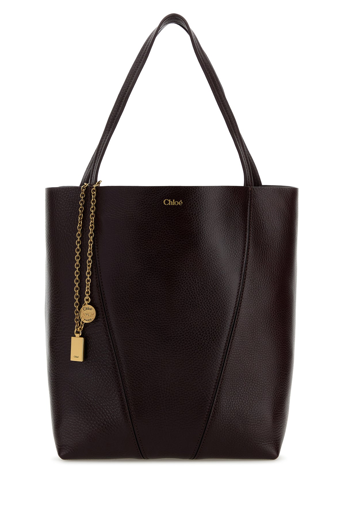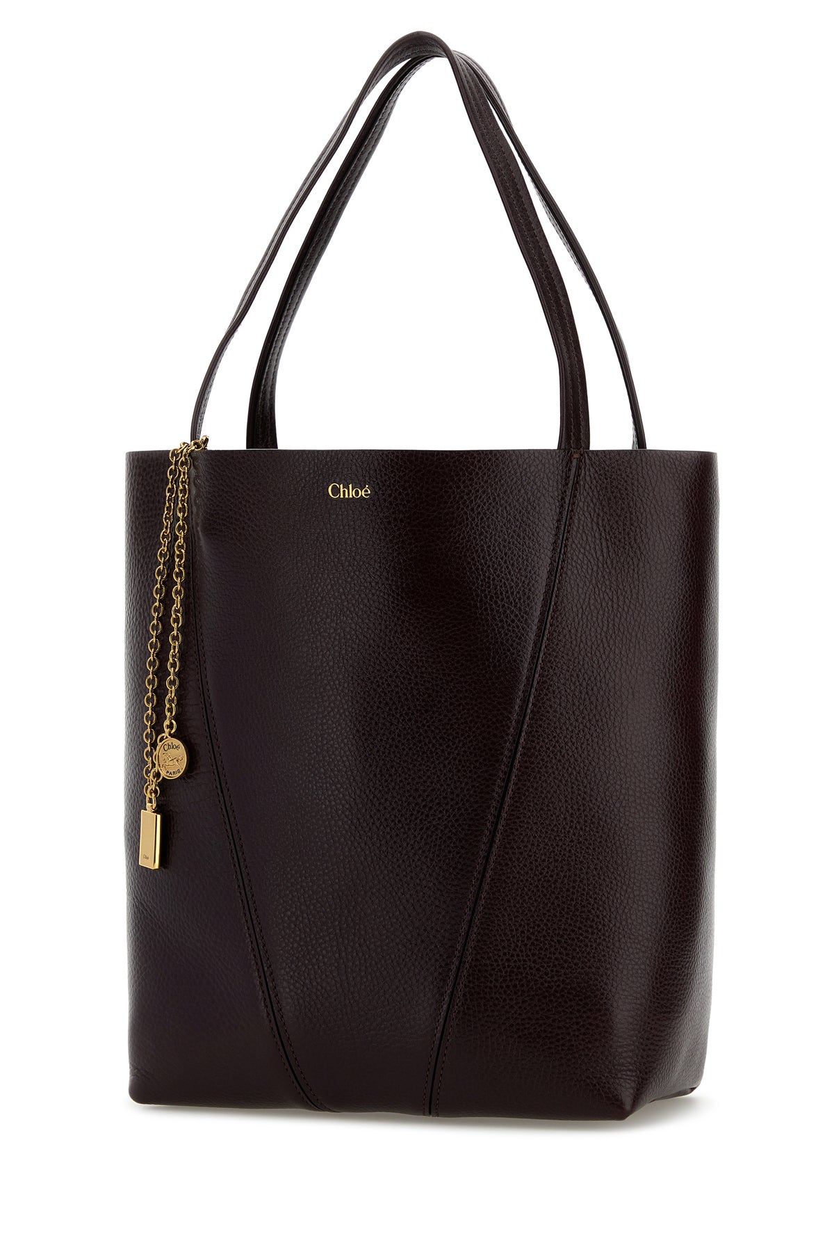 Shopping bag realized in pebble calf leather characterized by laminated printed logo at the front enriched by detachable metal accessory with logoed charms.