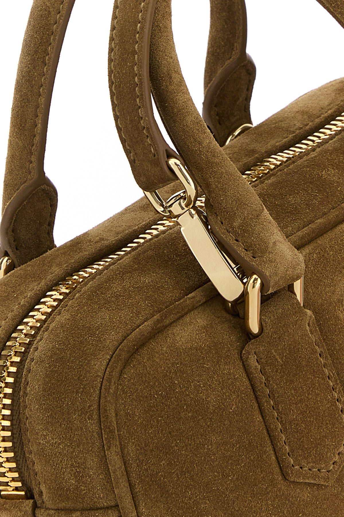 Handbag realized in suede enriched by tonal metal lettering logo at the front.