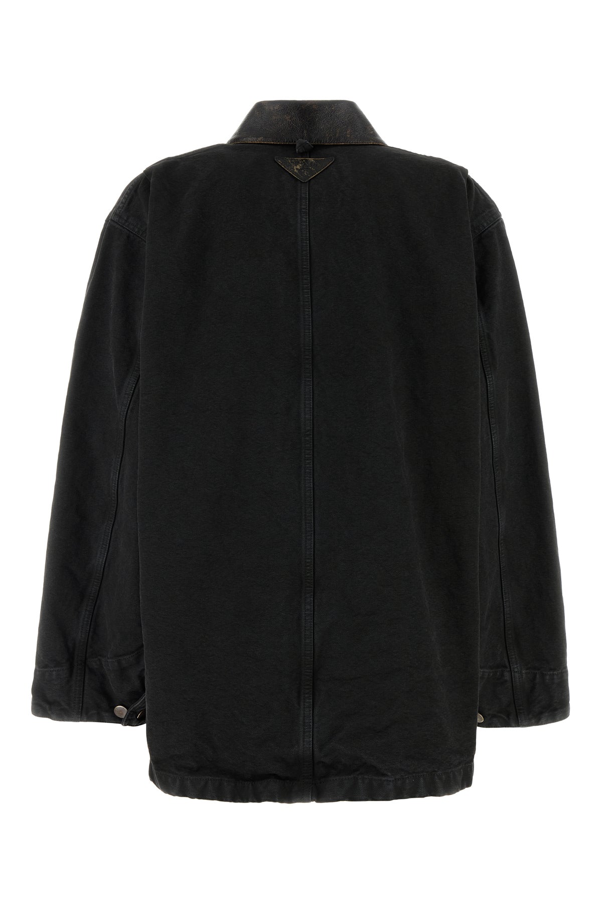 Jacket realized in stonewashed pure cotton denim enriched by leather iconic logoed triangle at the back.