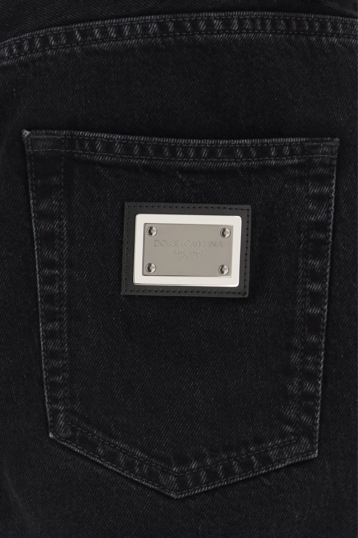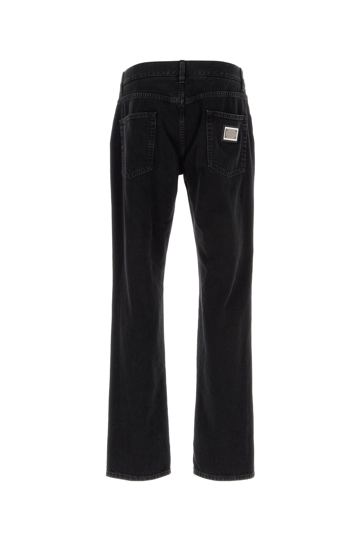 Jeans realized in pure cotton denim enriched by metal logoed plate at the back.