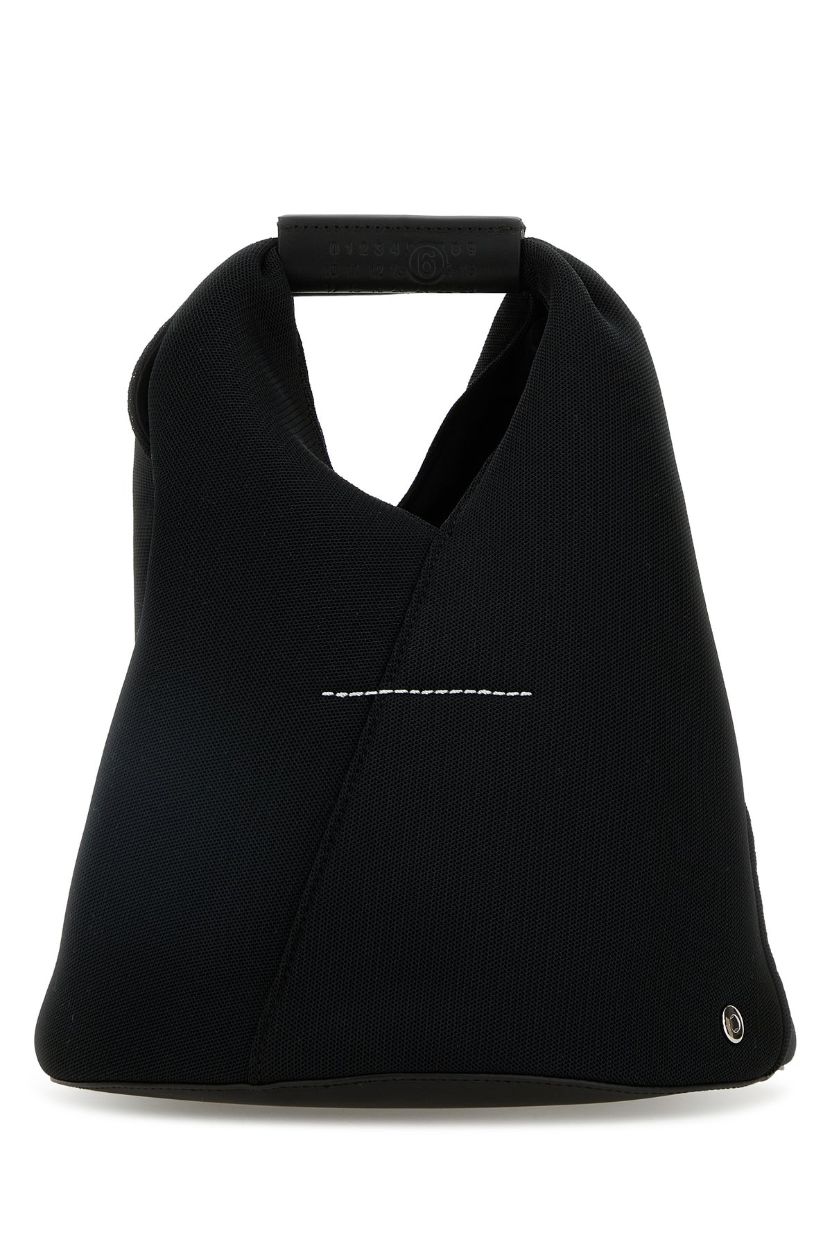 Handbag realized in fabric characterized by iconic contrasting stitching at the back.
