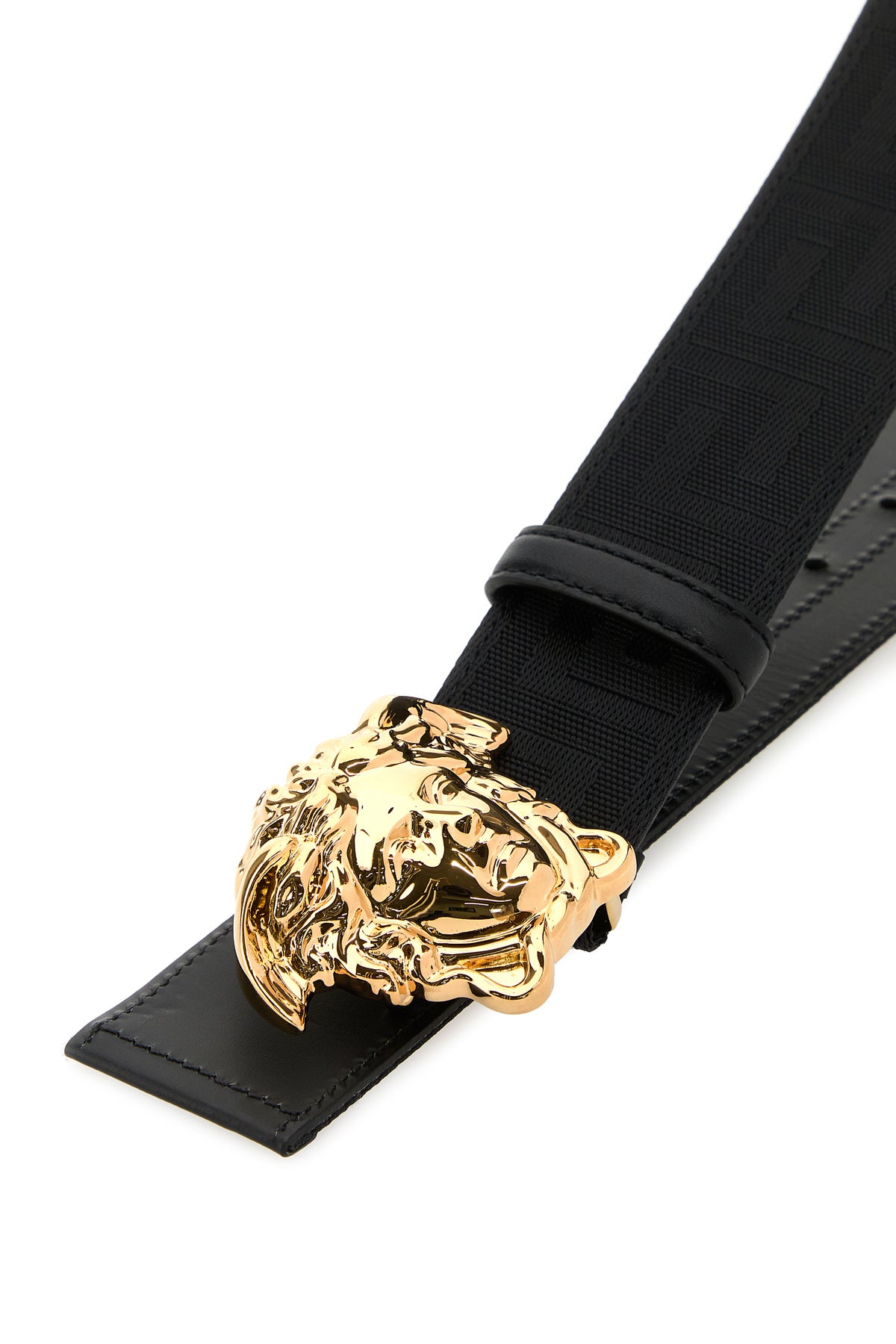 Belt realized in fabric characterized by La Greca embroidery on the entire surface enriched by metal iconic Medusa Head buckle.